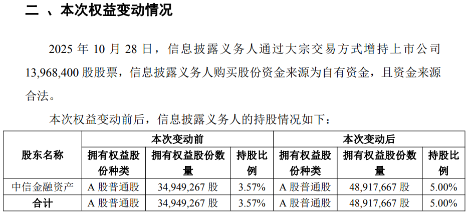 10月29日晚间,杭氧股份(002430.SZ)公告称,中信金融资产基于对杭氧股份发展前景的看好及其价值的认可,于2025年10月28日以大宗交易方式增持公司股份13,968,400股,占公司总股本的1.43%。本次权益变动后,中信金融资产持有公司股份48,917,667股,占公司总股本的5.00%。本次权益变动不会导致公司控股股东及实际控制人发生变化。