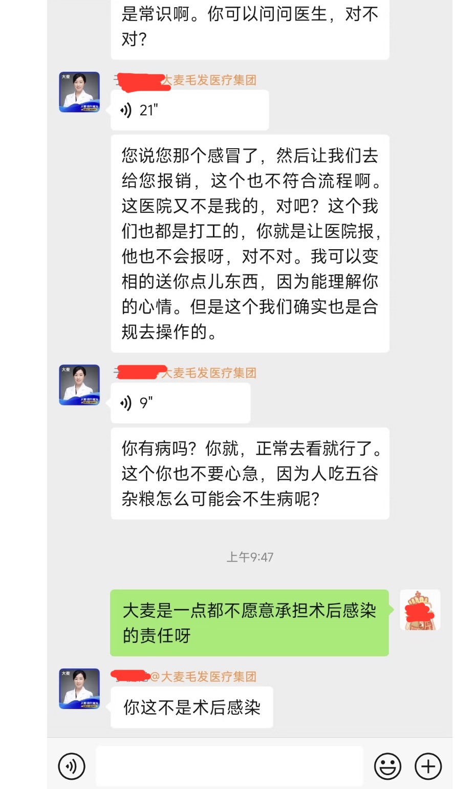 消费者给出的聊天记录中,大麦植发售后人员称,此症状并非术后感染。