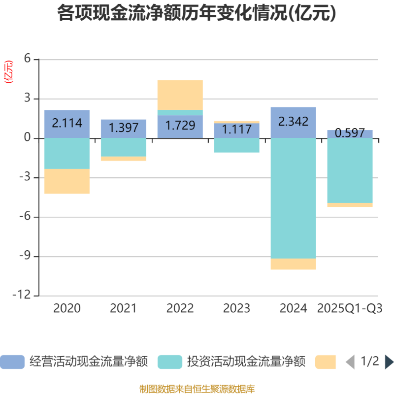 2025年前三季度,公司经营活动现金流净额为5971.29万元,同比下降54.73%;筹资活动现金流净额-3041.93万元,同比增加133.23万元;投资活动现金流净额-4.95亿元,上年同期为-3.41亿元。