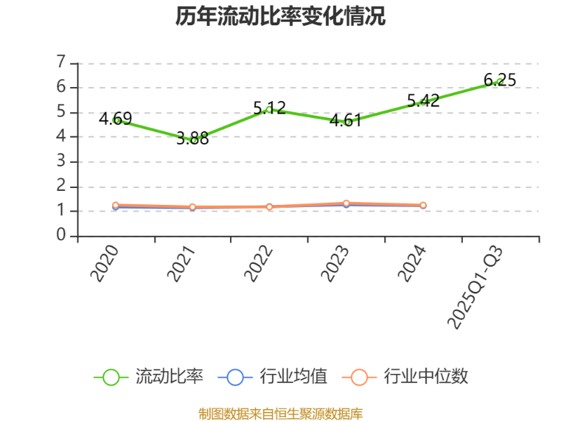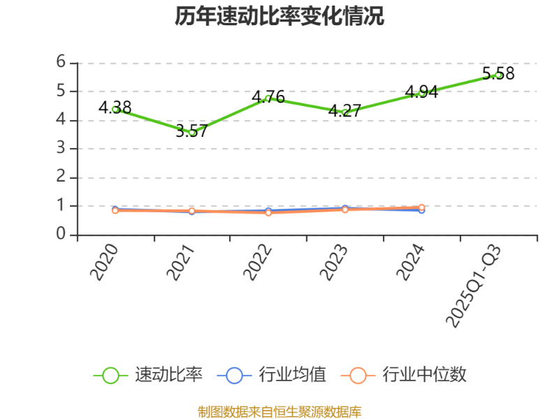 2025年前三季度,公司流动比率为6.25,速动比率为5.58。