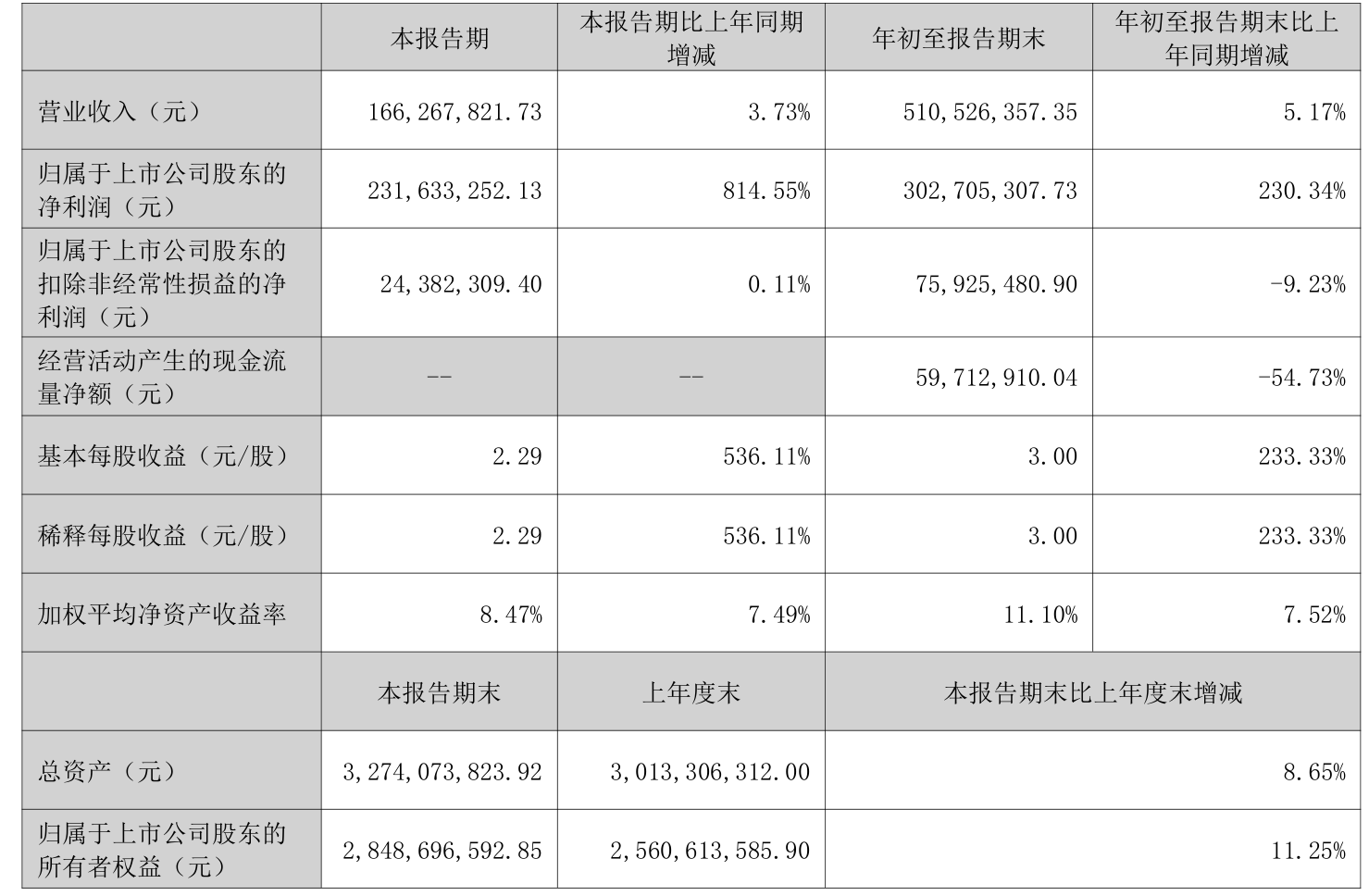 中证智能财讯兆丰股份(300695)10月30日披露2025年第三季度报告。前三季度公司实现营业总收入5.11亿元,同比增长5.17%;归母净利润3.03亿元,同比增长230.34%;扣非净利润7592.55万元,同比下降9.23%;经营活动产生的现金流量净额为5971.29万元,同比下降54.73%;报告期内,兆丰股份基本每股收益为3.00元,加权平均净资产收益率为11.10%。