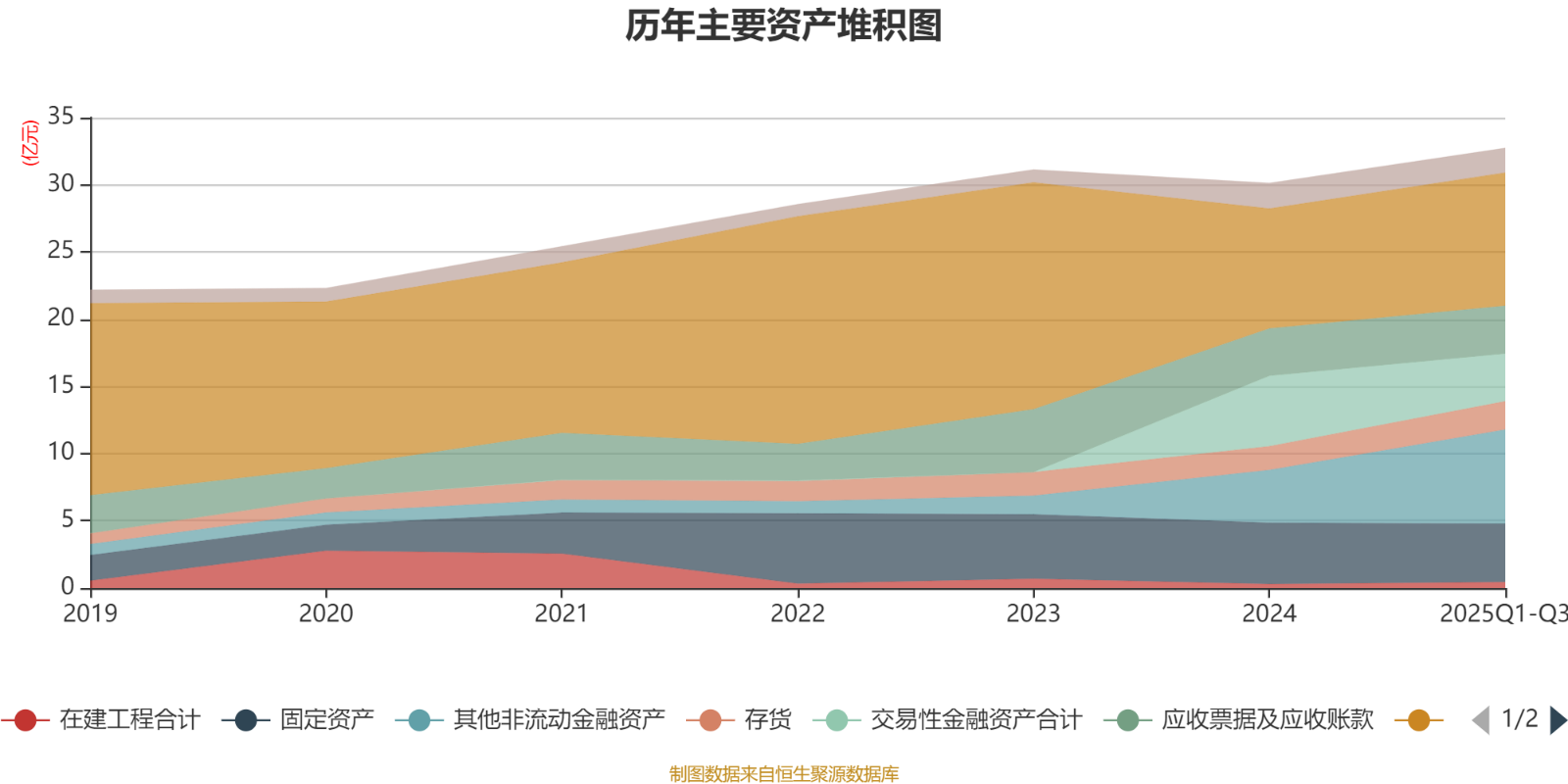 资产重大变化方面,截至2025年三季度末,公司其他非流动金融资产较上年末增加78.11%,占公司总资产比重上升8.34个百分点;交易性金融资产合计较上年末减少32.27%,占公司总资产比重下降6.53个百分点;固定资产较上年末减少4.66%,占公司总资产比重下降1.85个百分点;其他非流动资产较上年末减少80%,占公司总资产比重下降1.23个百分点。