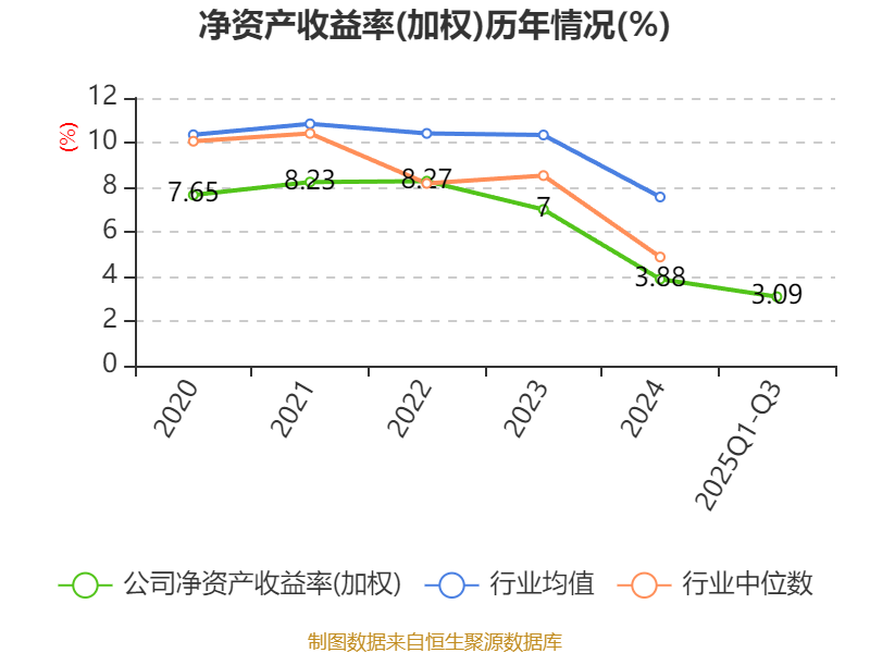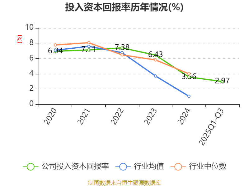 盈利能力方面, 2025年前三季度公司加权平均净资产收益率为3.09%,同比下降0.21个百分点。公司2025年前三季度投入资本回报率为2.97%,较上年同期下降0.02个百分点。
