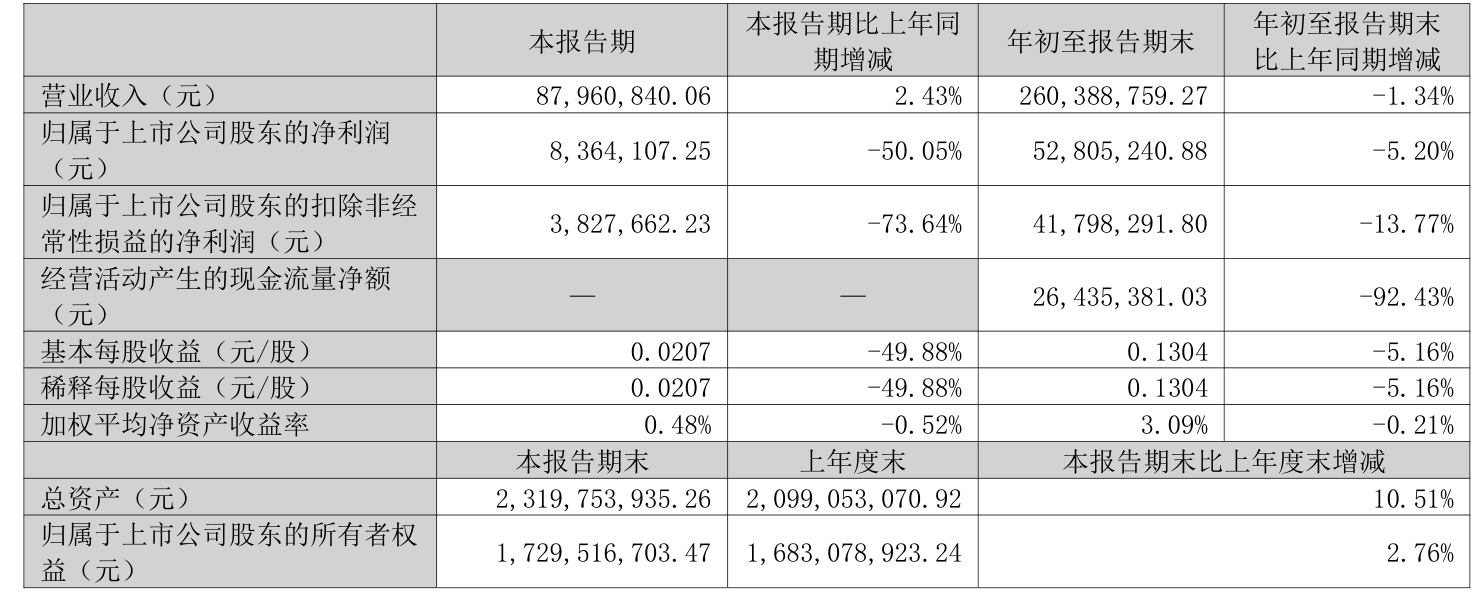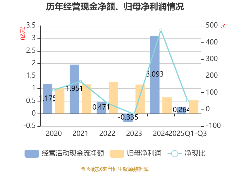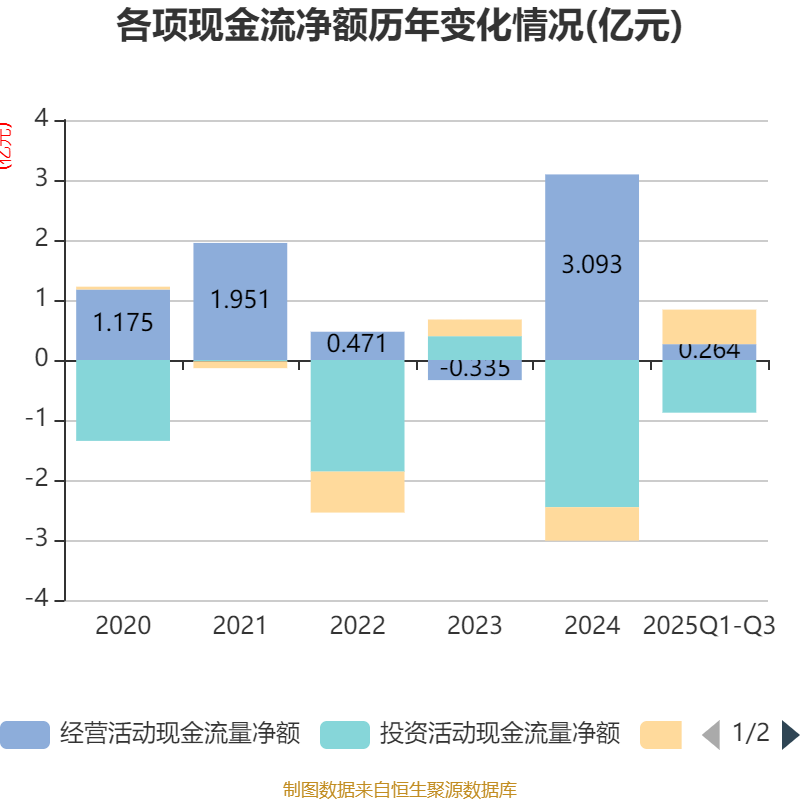 2025年前三季度,公司经营活动现金流净额为2643.54万元,同比下降92.43%;筹资活动现金流净额5761.97万元,同比增加6890.11万元;投资活动现金流净额-8778.21万元,上年同期为-2.63亿元。