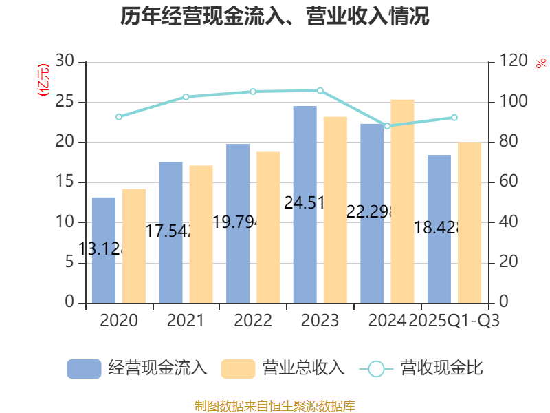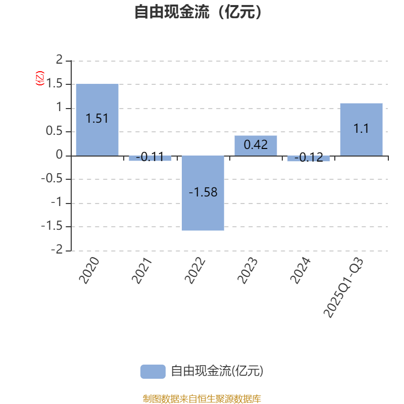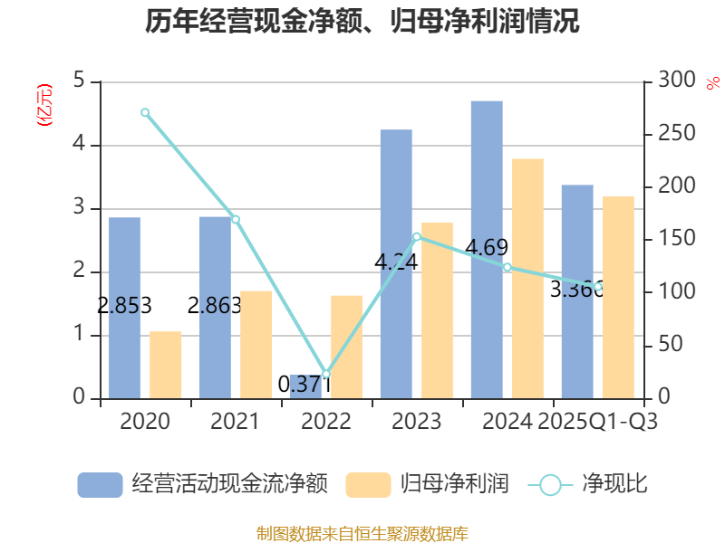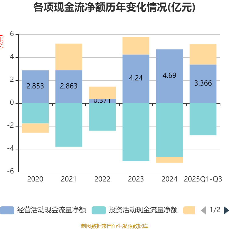 2025年前三季度,公司经营活动现金流净额为3.37亿元,同比增长52.42%;筹资活动现金流净额1.77亿元,同比增加8063.65万元;投资活动现金流净额-2.82亿元,上年同期为-2.7亿元。