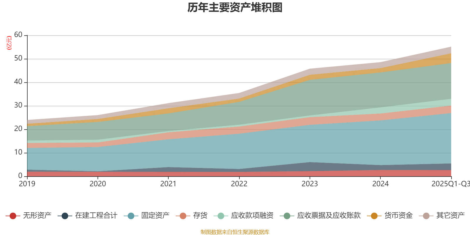 资产重大变化方面,截至2025年三季度末,公司货币资金较上年末增加125.88%,占公司总资产比重上升3.76个百分点;应收票据及应收账款较上年末增加2.35%,占公司总资产比重下降3.03个百分点;在建工程合计较上年末增加37.01%,占公司总资产比重上升0.87个百分点;无形资产较上年末减少1.39%,占公司总资产比重下降0.73个百分点。