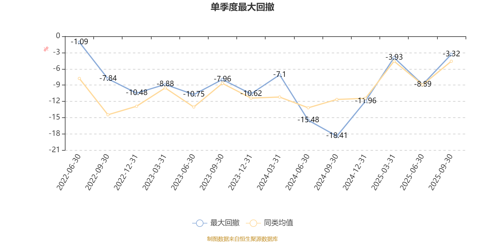 截至10月29日,基金近三年最大回撤为35.07%,同类可比基金排名32/74。单季度最大回撤出现在2024年三季度,为18.41%。