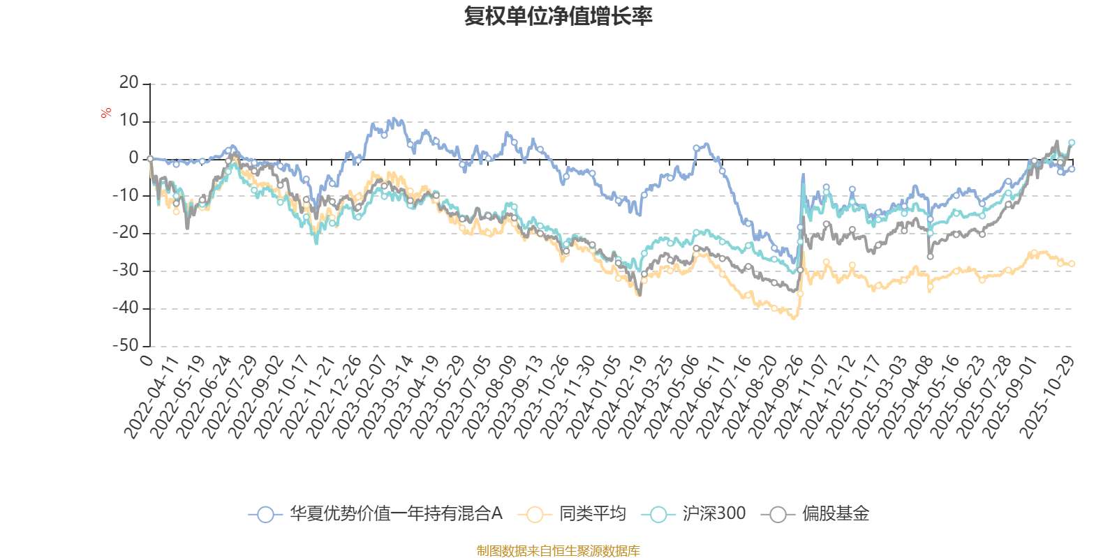 截至10月29日,华夏优势价值一年持有混合A近三个月复权单位净值增长率为3.48%,位于同类可比基金28/85;近半年复权单位净值增长率为10.44%,位于同类可比基金18/85;近一年复权单位净值增长率为7.80%,位于同类可比基金41/82;近三年复权单位净值增长率为11.68%,位于同类可比基金19/74。