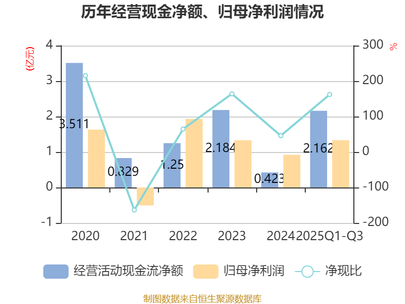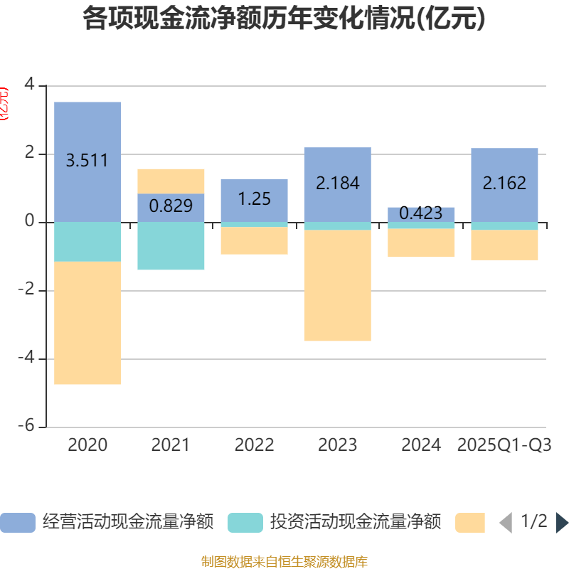 2025年前三季度,公司经营活动现金流净额为2.16亿元,同比增长23496.18%;筹资活动现金流净额-8837.59万元,同比增加301.67万元;投资活动现金流净额-2389.89万元,上年同期为-1911.25万元。