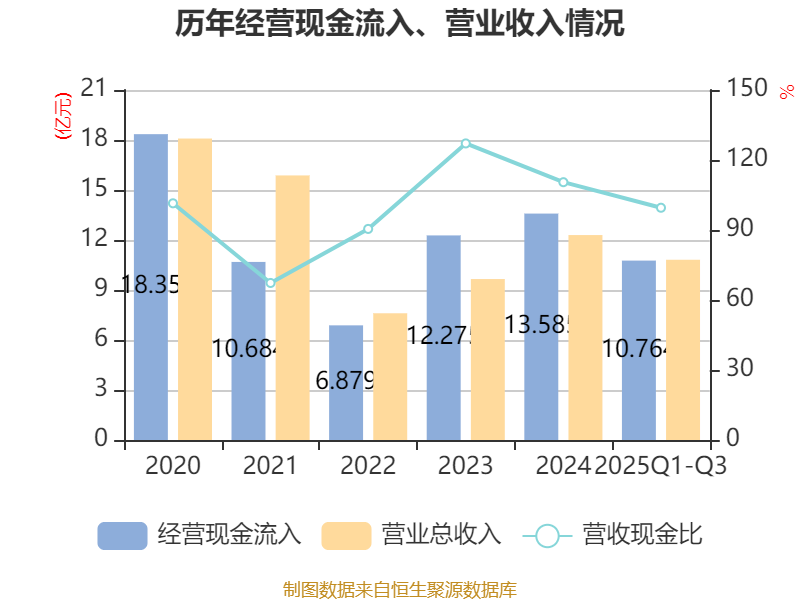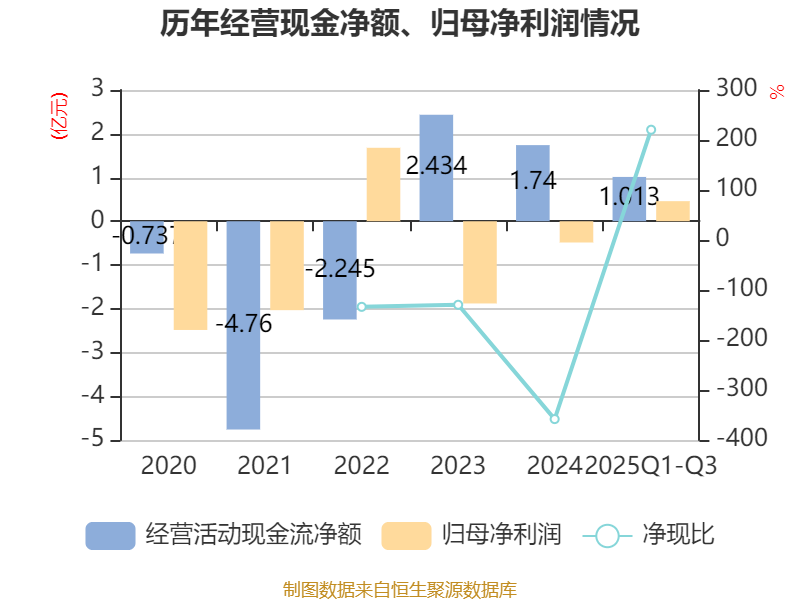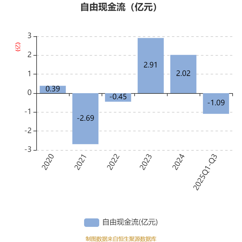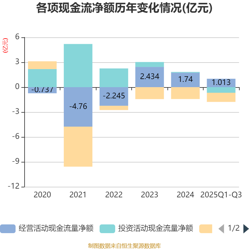 2025年前三季度,公司经营活动现金流净额为1.01亿元,同比下降21.49%;筹资活动现金流净额-1.1亿元,同比增加1278.85万元;投资活动现金流净额-6754.14万元,上年同期为-2294.33万元。