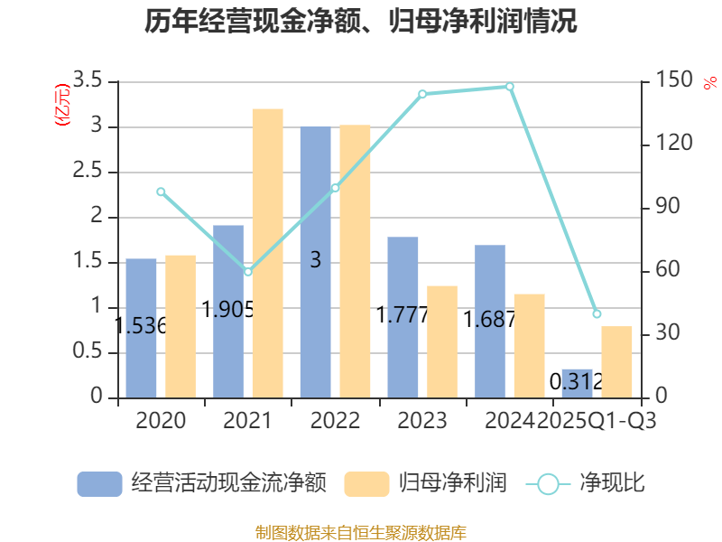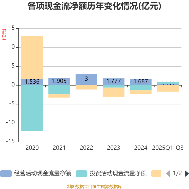 2025年前三季度,公司经营活动现金流净额为3124.68万元,同比下降78.04%;筹资活动现金流净额-1.74亿元,同比减少1.73亿元;投资活动现金流净额4965.47万元,上年同期为-1.79亿元。