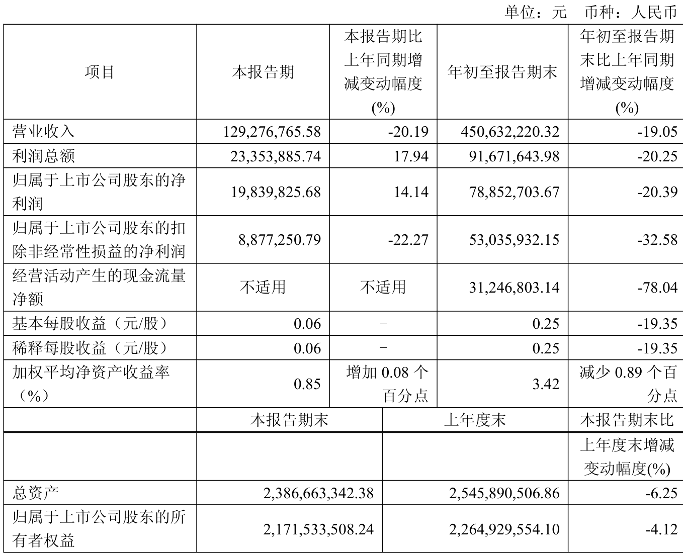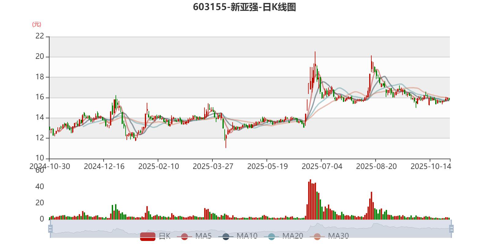 中证智能财讯新亚强(603155)10月30日披露2025年第三季度报告。前三季度公司实现营业总收入4.51亿元,同比下降19.05%;归母净利润7885.27万元,同比下降20.39%;扣非净利润5303.59万元,同比下降32.58%;经营活动产生的现金流量净额为3124.68万元,同比下降78.04%;报告期内,新亚强基本每股收益为0.25元,加权平均净资产收益率为3.42%。