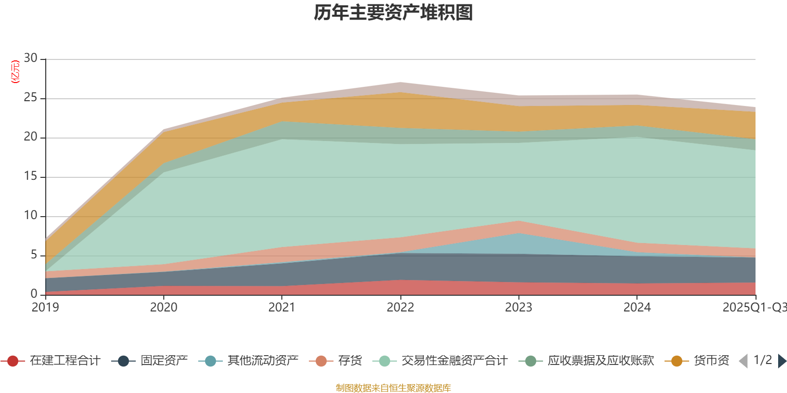 资产重大变化方面,截至2025年三季度末,公司货币资金较上年末增加34.03%,占公司总资产比重上升4.39个百分点;无形资产较上年末减少82.59%,占公司总资产比重下降3.1个百分点;其他流动资产较上年末减少99.53%,占公司总资产比重下降2.04个百分点;在建工程合计较上年末增加8.34%,占公司总资产比重上升0.88个百分点。