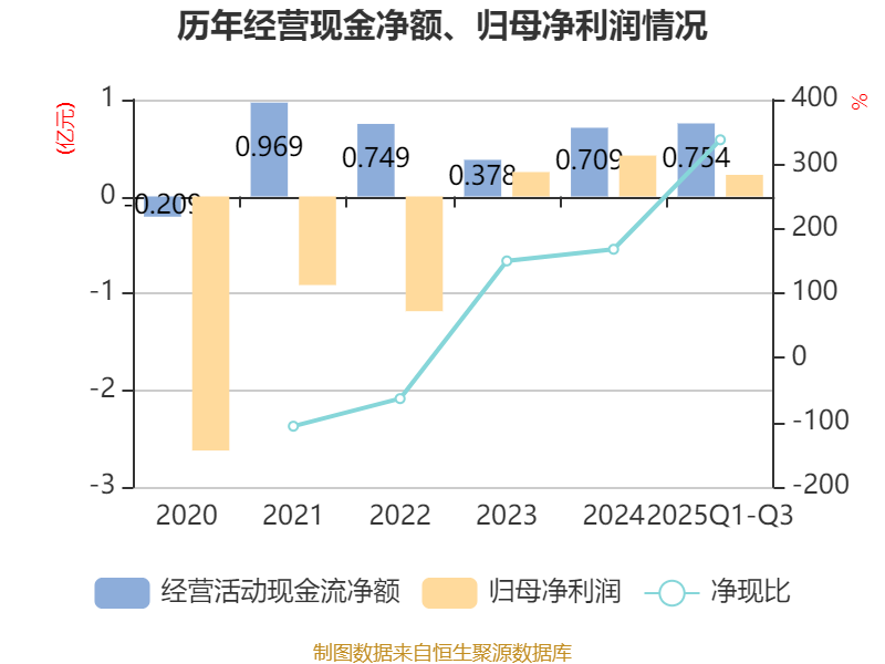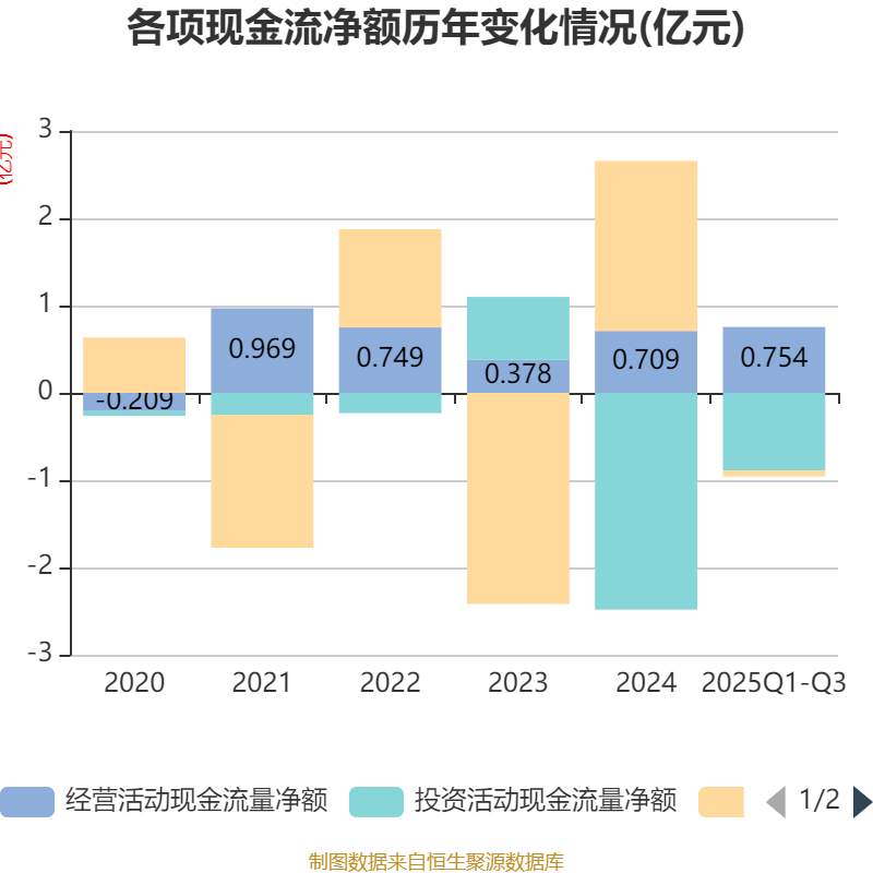 2025年前三季度,公司经营活动现金流净额为7541.19万元,同比增长19.56%;筹资活动现金流净额-714.35万元,同比减少4791.76万元;投资活动现金流净额-8881.05万元,上年同期为-5937.13万元。