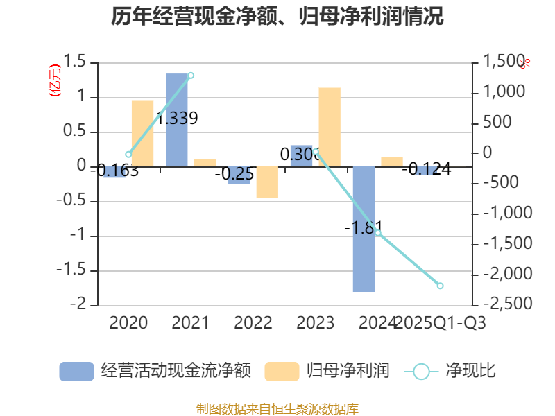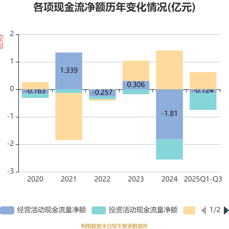 2025年前三季度,公司经营活动现金流净额为-1238.25万元,同比增加1.52亿元;筹资活动现金流净额6255.89万元,同比减少485.52万元;投资活动现金流净额-6236.63万元,上年同期为-6496.27万元。