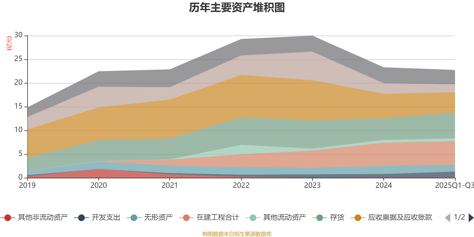 资产重大变化方面,截至2025年三季度末,公司存货较上年末增加17.63%,占公司总资产比重上升4.03个百分点;应收票据及应收账款较上年末减少15.43%,占公司总资产比重下降2.95个百分点;开发支出较上年末增加63.5%,占公司总资产比重上升2.21个百分点;货币资金较上年末减少24.64%,占公司总资产比重下降2.17个百分点。