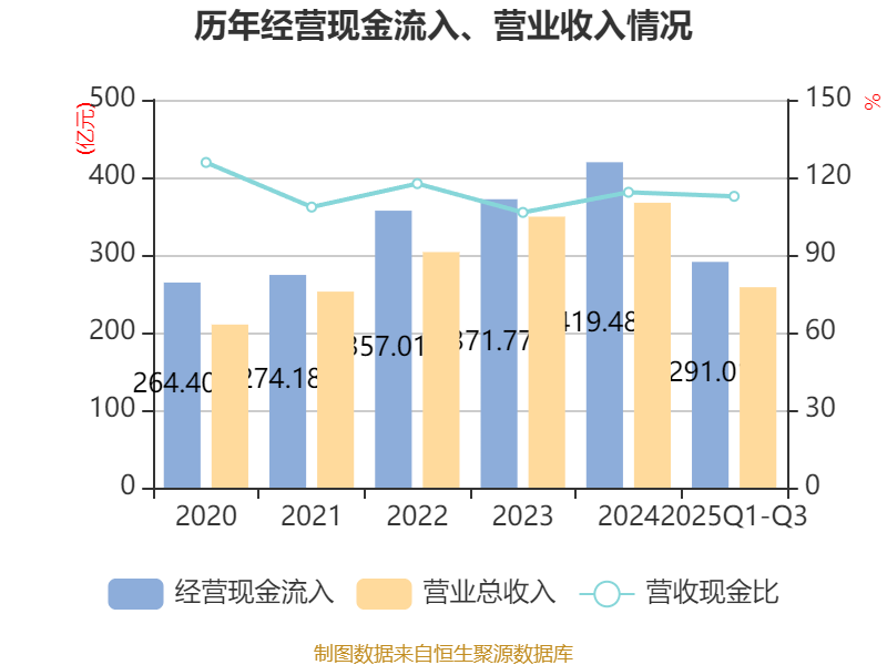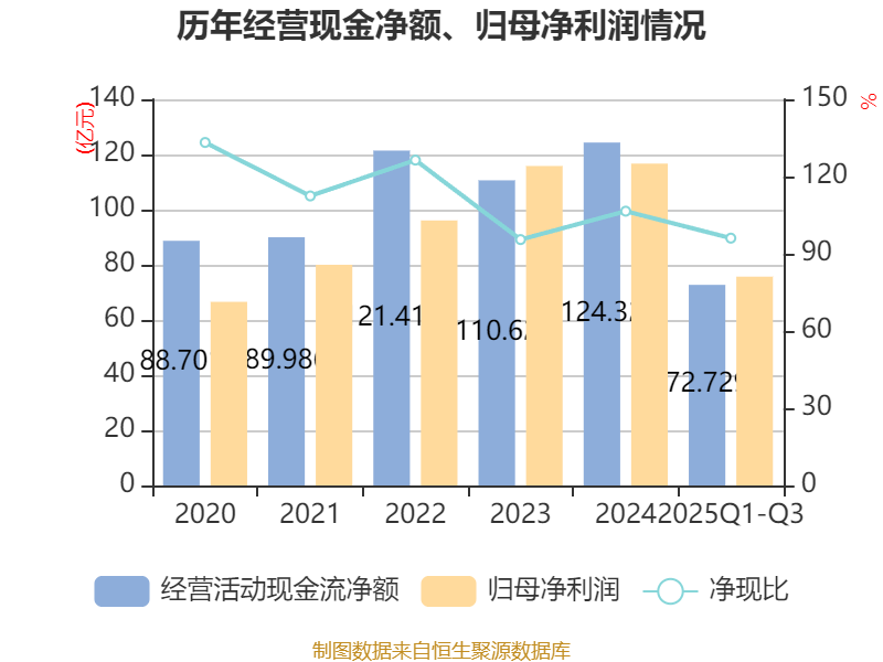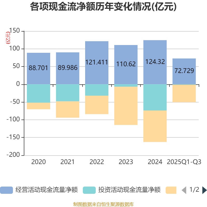 2025年前三季度,公司经营活动现金流净额为72.73亿元,同比下降34.32%;筹资活动现金流净额-49.29亿元,同比增加19.29亿元;投资活动现金流净额-1.26亿元,上年同期为-72.1亿元。