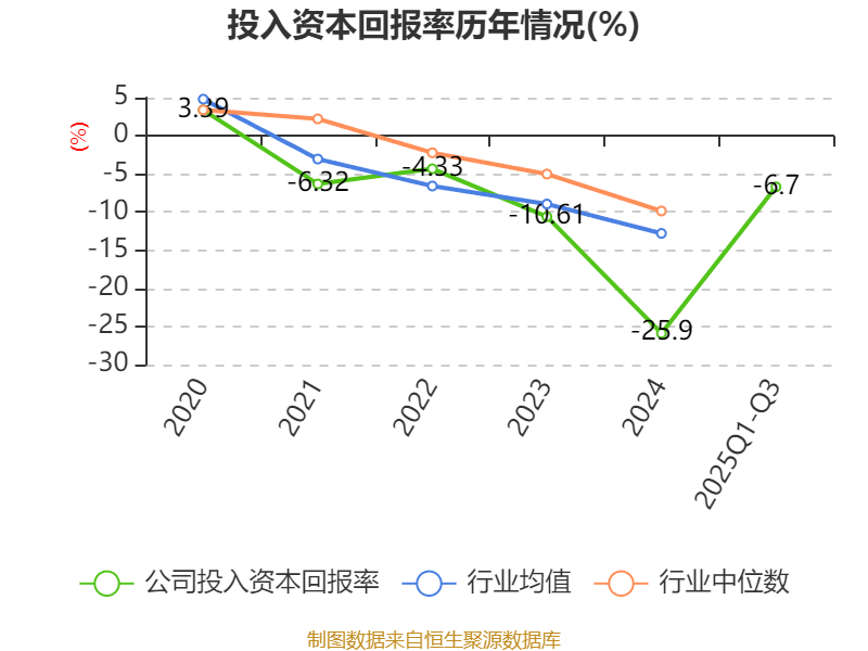 盈利能力方面, 2025年前三季度公司加权平均净资产收益率为-36.74%,同比下降17.15个百分点。公司2025年前三季度投入资本回报率为-6.7%,较上年同期下降0.76个百分点。