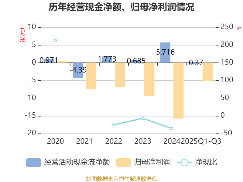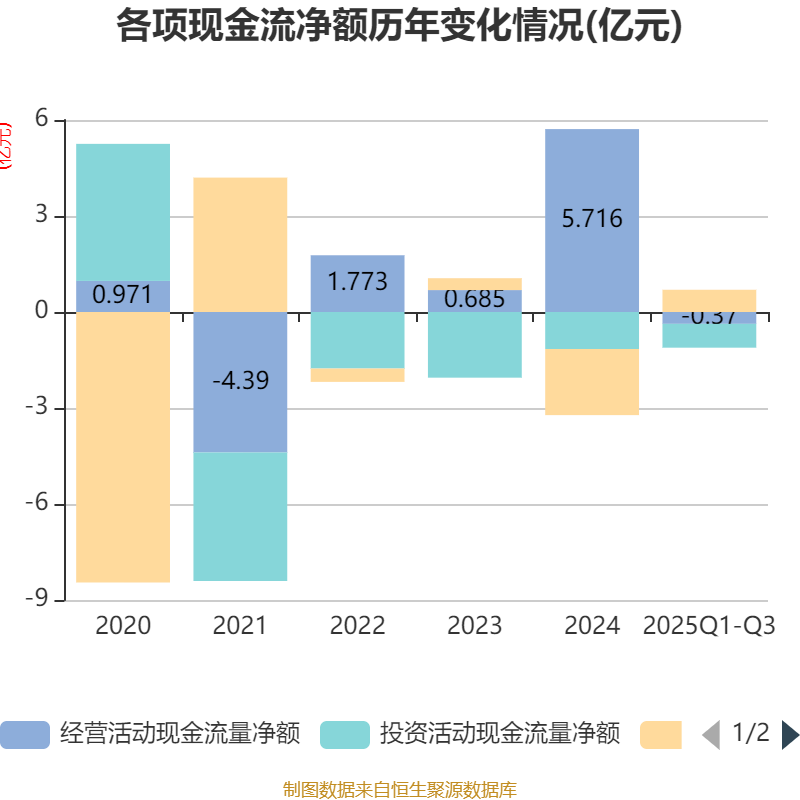 2025年前三季度,公司经营活动现金流净额为-3695.43万元,同比减少3.8亿元;筹资活动现金流净额6947.28万元,同比增加6858.38万元;投资活动现金流净额-7452.88万元,上年同期为-9718.98万元。