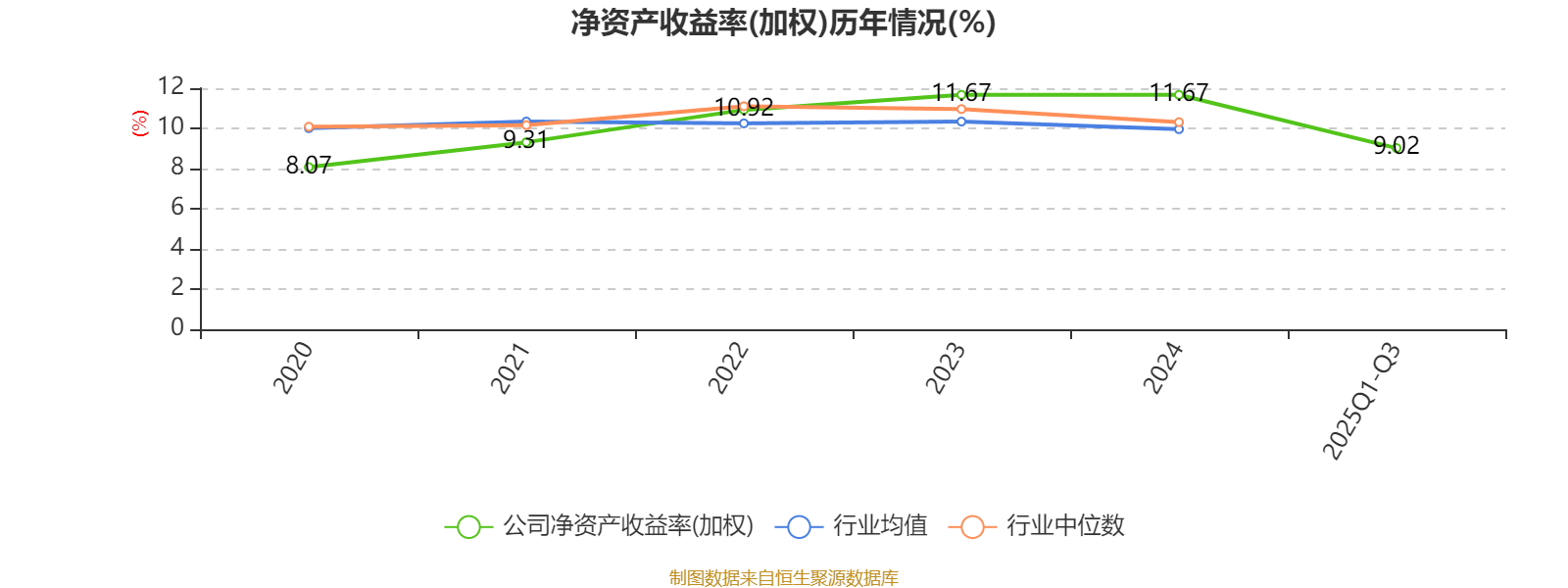 盈利能力方面, 2025年前三季度公司加权平均净资产收益率为9.02%,同比下降0.66个百分点。