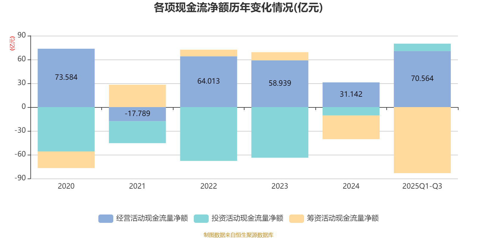 2025年前三季度,公司经营活动现金流净额为70.56亿元,同比增加72.26亿元;筹资活动现金流净额-83.23亿元,同比减少46.4亿元;投资活动现金流净额9.42亿元,上年同期为17.62亿元。