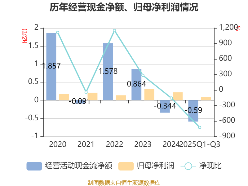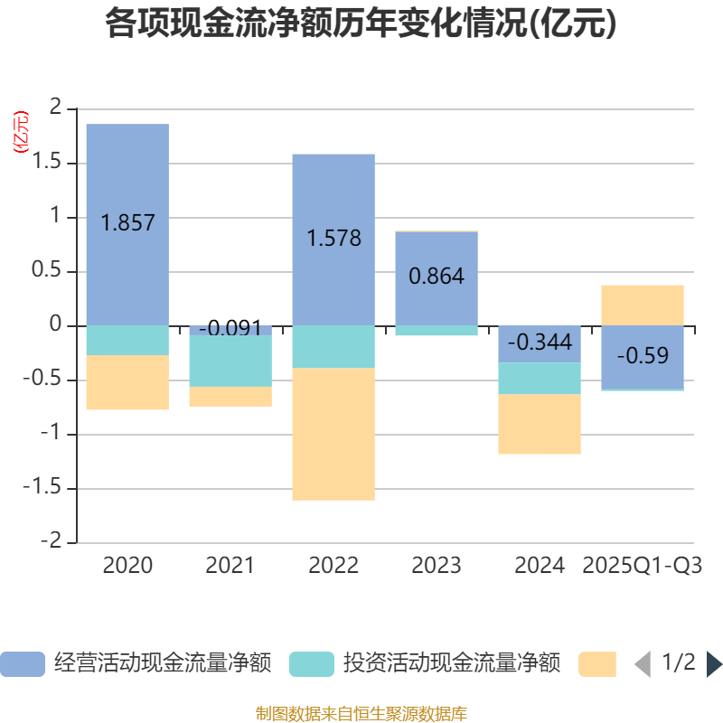 2025年前三季度,公司经营活动现金流净额为-5895.49万元,同比增加1.24亿元;筹资活动现金流净额3693.55万元,同比增加3962.42万元;投资活动现金流净额-152.77万元,上年同期为-2546.47万元。