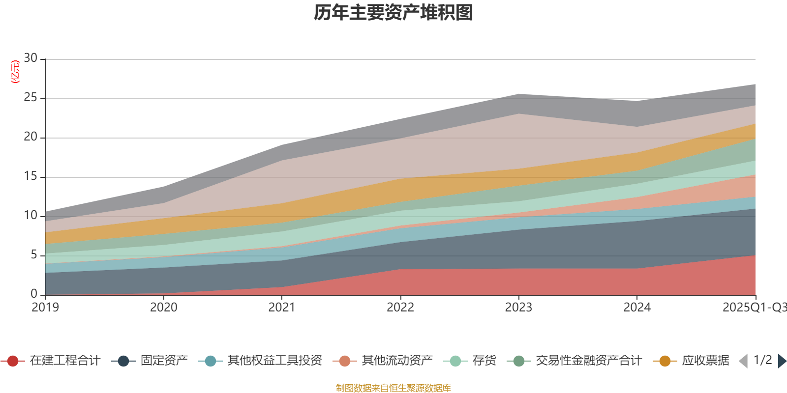 资产重大变化方面,截至2025年三季度末,公司在建工程合计较上年末增加51.11%,占公司总资产比重上升5.27个百分点;货币资金较上年末减少28.84%,占公司总资产比重下降4.57个百分点;其他流动资产较上年末增加85.5%,占公司总资产比重上升4.37个百分点;交易性金融资产合计较上年末增加68.27%,占公司总资产比重上升3.69个百分点。