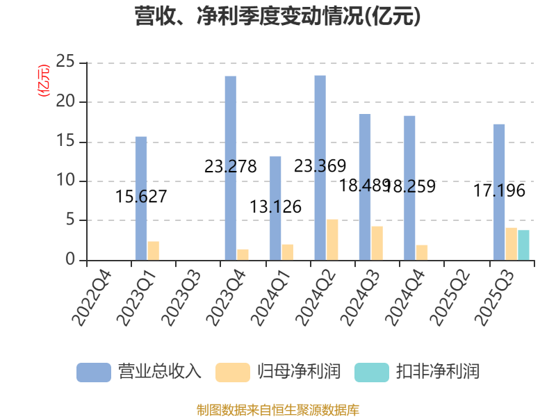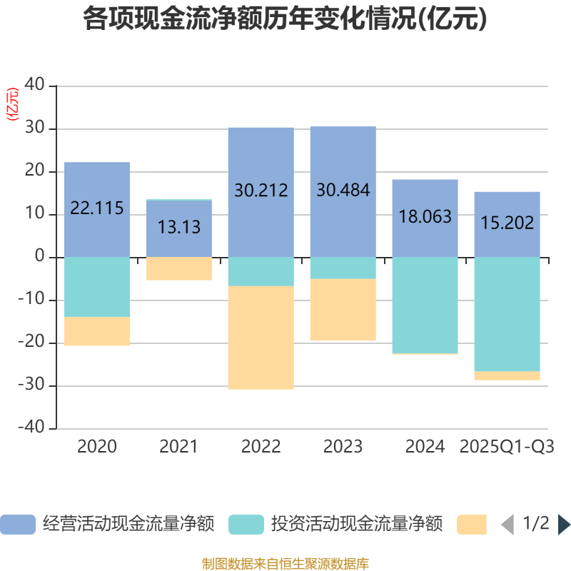 2025年前三季度,公司经营活动现金流净额为15.2亿元,同比增长41.25%;筹资活动现金流净额-2.02亿元,同比减少1.57亿元;投资活动现金流净额-26.74亿元,上年同期为-17.84亿元。