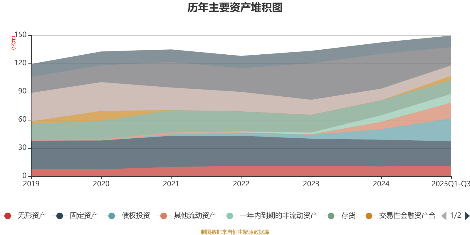 资产重大变化方面,截至2025年三季度末,公司货币资金较上年末减少47.37%,占公司总资产比重下降13个百分点;债权投资较上年末增加115.21%,占公司总资产比重上升8.32个百分点;其他流动资产较上年末增加116.4%,占公司总资产比重上升5.78个百分点;交易性金融资产合计较上年末增加56235.75%,占公司总资产比重上升3.05个百分点。