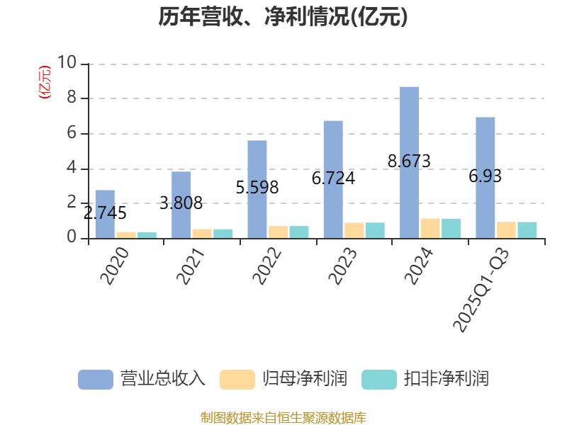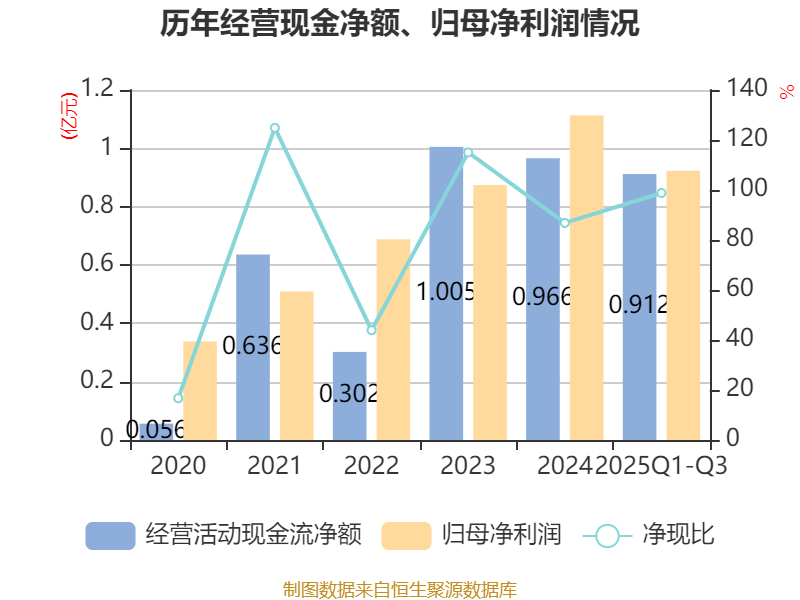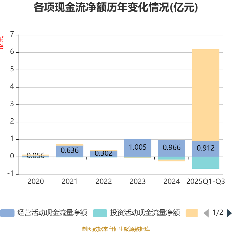 2025年前三季度,公司经营活动现金流净额为9119.41万元,同比增长111%;筹资活动现金流净额5.26亿元,同比增加5.35亿元;投资活动现金流净额-7015.6万元,上年同期为-1174.39万元。