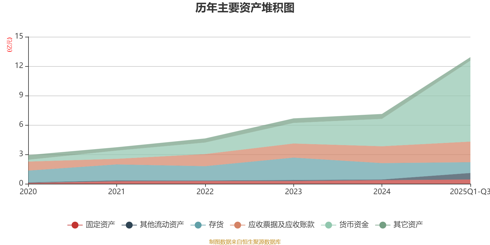 资产重大变化方面,截至2025年三季度末,公司货币资金较上年末增加195.56%,占公司总资产比重上升24.72个百分点;存货较上年末减少34.07%,占公司总资产比重下降14.94个百分点;应收票据及应收账款较上年末增加21.97%,占公司总资产比重下降7.93个百分点;其他流动资产较上年末增加971.75%,占公司总资产比重上升4.27个百分点。