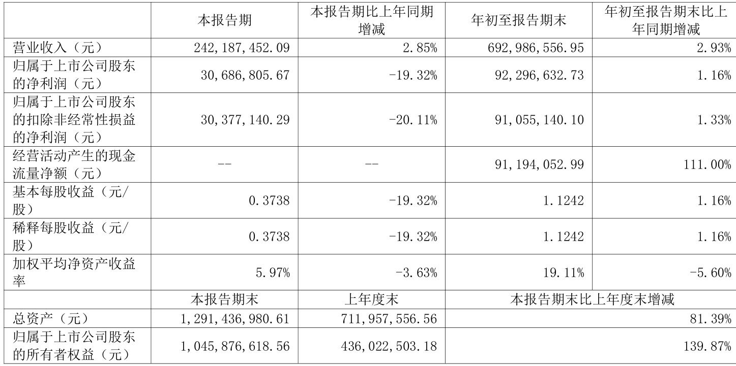 中证智能财讯昊创瑞通(301668)10月30日披露2025年第三季度报告。前三季度公司实现营业总收入6.93亿元,同比增长2.93%;归母净利润9229.66万元,同比增长1.16%;扣非净利润9105.51万元,同比增长1.33%;经营活动产生的现金流量净额为9119.41万元,同比增长111.00%;报告期内,昊创瑞通基本每股收益为1.1242元,加权平均净资产收益率为19.11%。