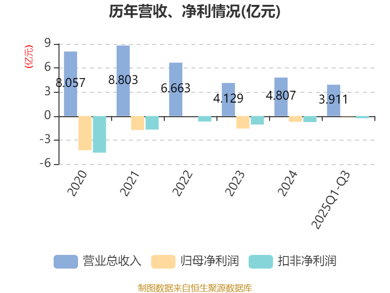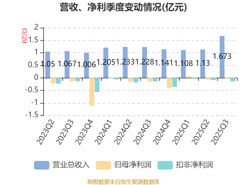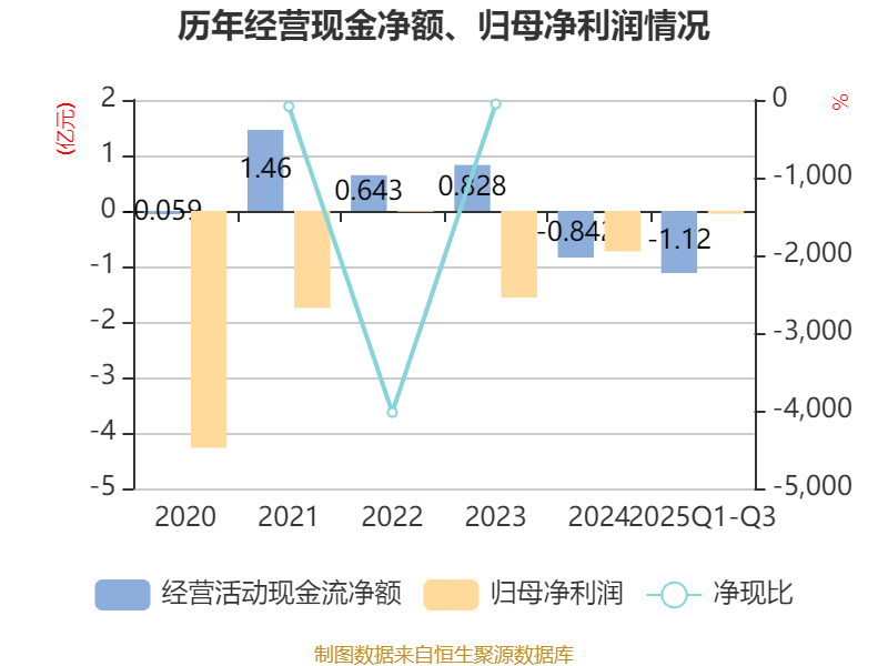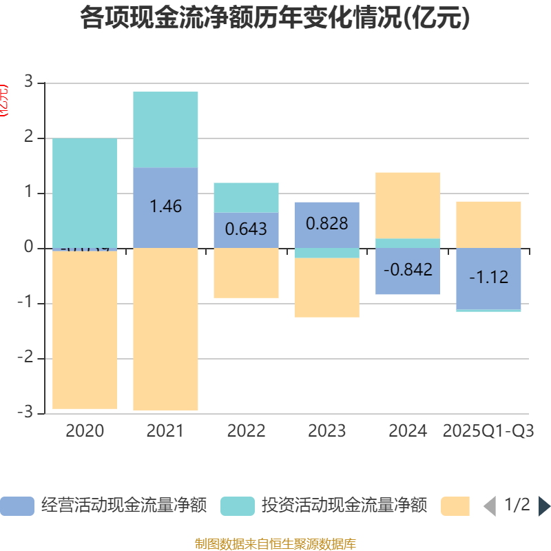 2025年前三季度,公司经营活动现金流净额为-1.12亿元,同比减少1.38亿元;筹资活动现金流净额8404.68万元,同比增加1.04亿元;投资活动现金流净额-392.84万元,上年同期为762.21万元。