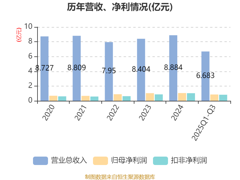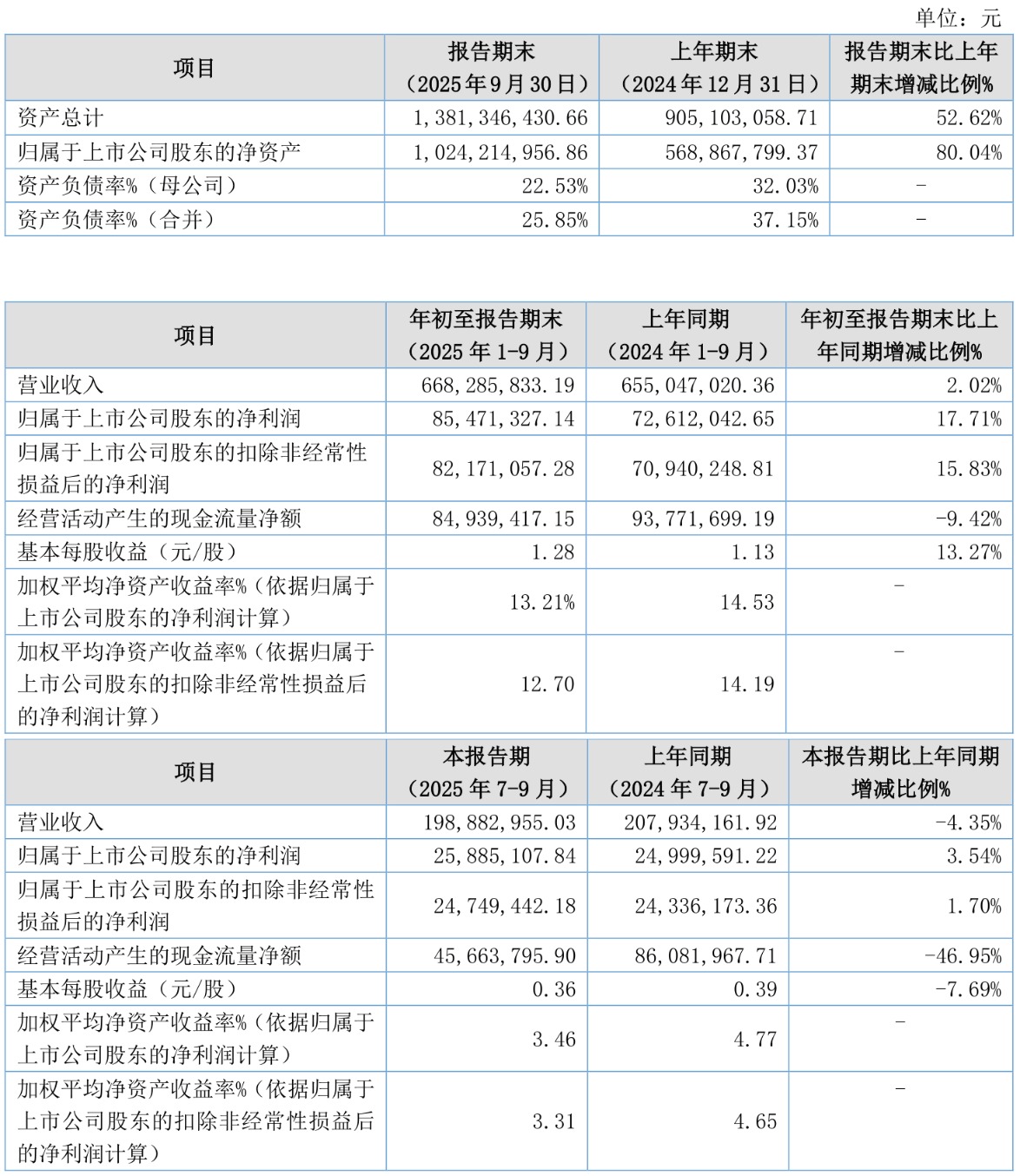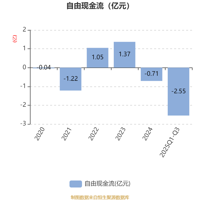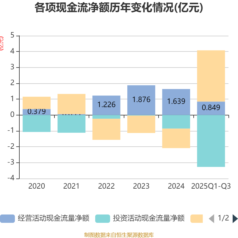 2025年前三季度,公司经营活动现金流净额为8493.94万元,同比下降9.42%;筹资活动现金流净额3.23亿元,同比增加3.92亿元;投资活动现金流净额-3.27亿元,上年同期为-2095.08万元。