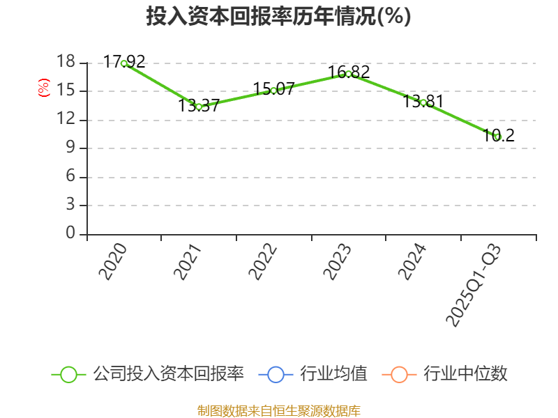 盈利能力方面, 2025年前三季度公司加权平均净资产收益率为13.21%,同比下降1.32个百分点。公司2025年前三季度投入资本回报率为10.2%,较上年同期下降6.34个百分点。