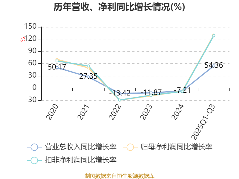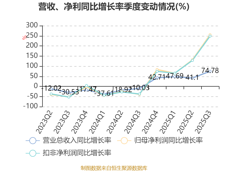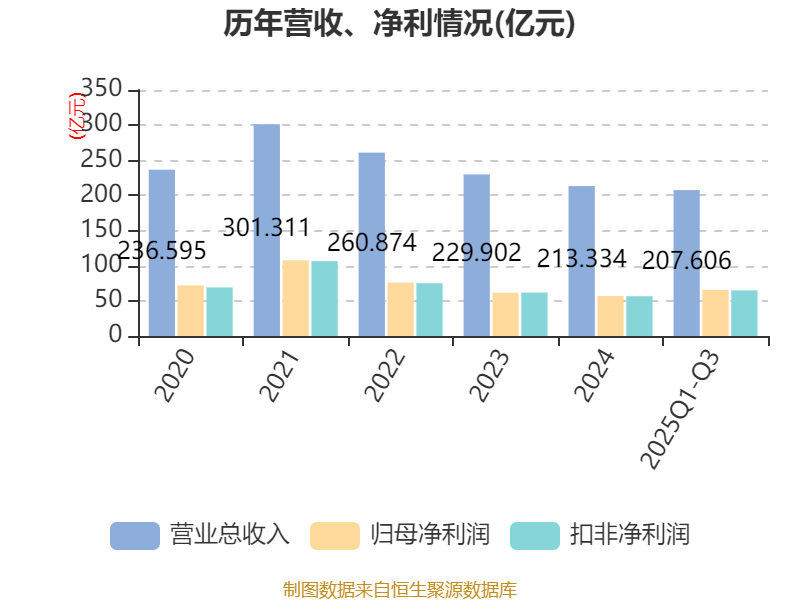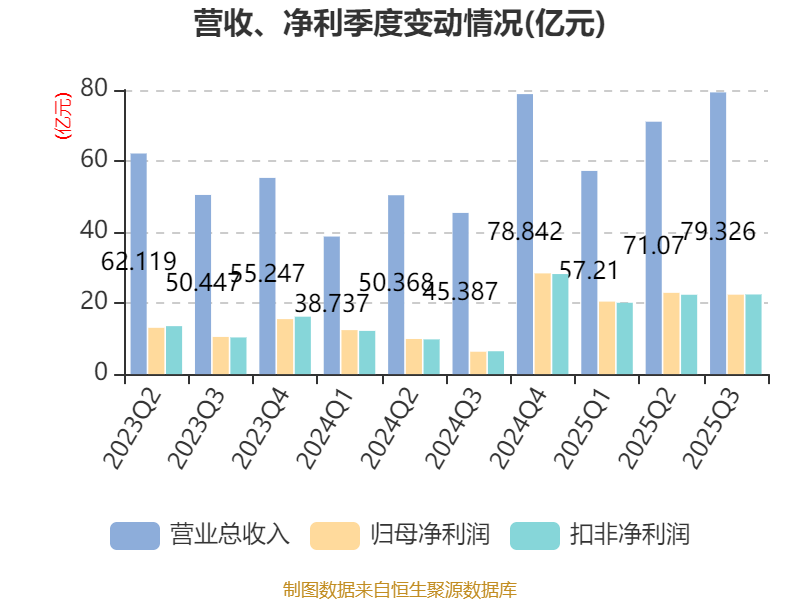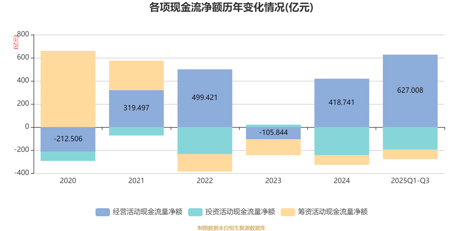 2025年前三季度,公司经营活动现金流净额为627.01亿元,同比增长157.26%;筹资活动现金流净额-83.06亿元,同比减少46.26亿元;投资活动现金流净额-195.51亿元,上年同期为-103.02亿元。
