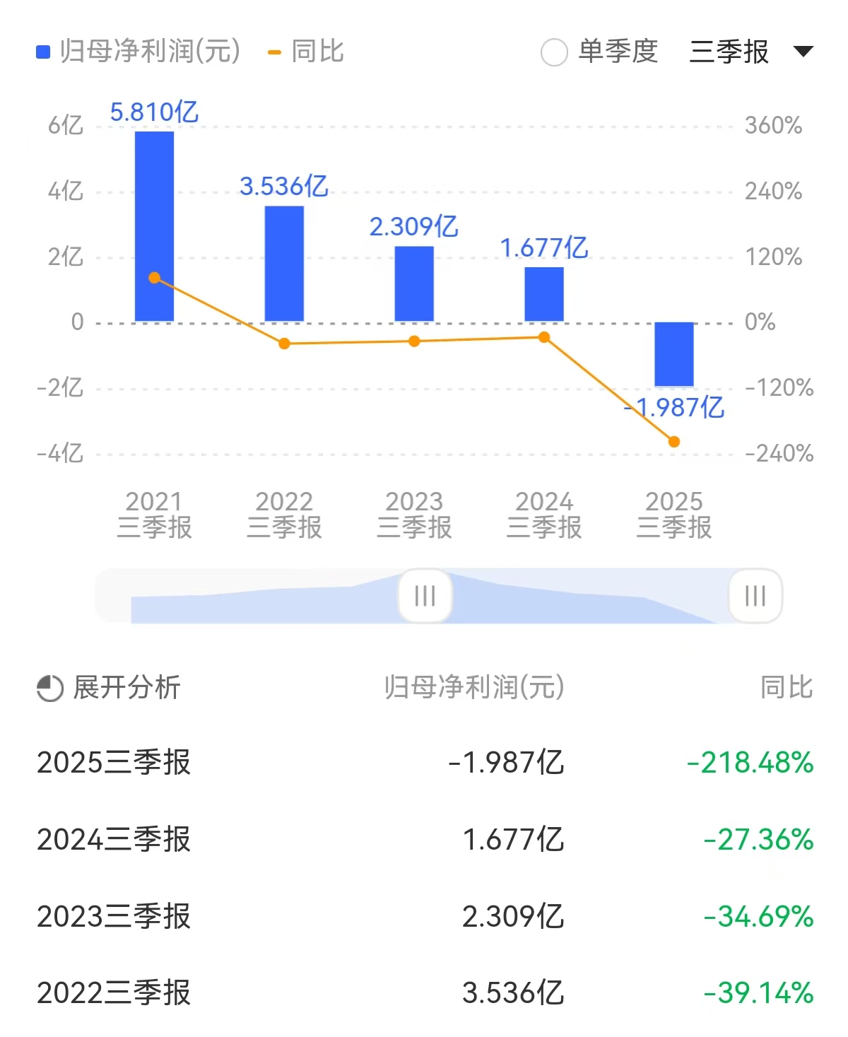 读创财经注意到,这是该公司自2022年以来连续4年三季报业绩下滑,同时也是公司2019年上市以来首现三季报亏损。