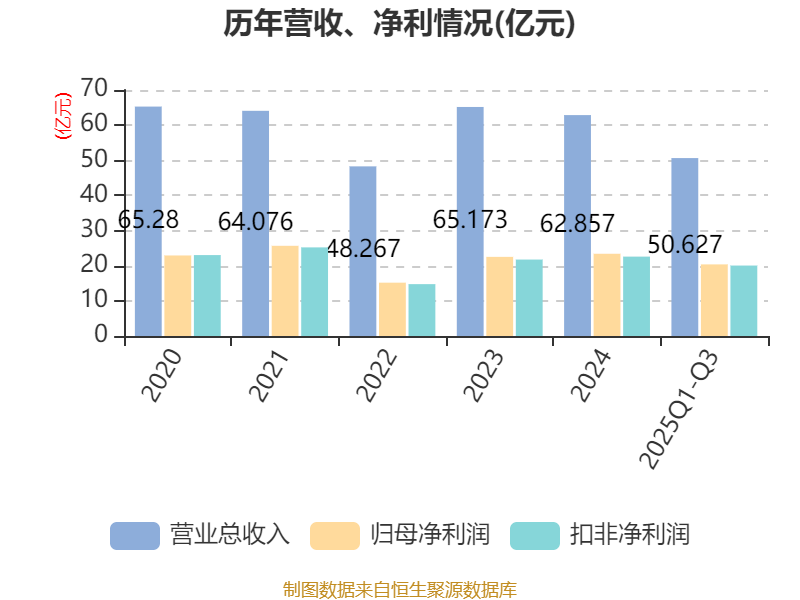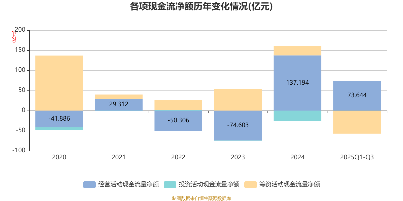 2025年前三季度,公司经营活动现金流净额为73.64亿元,同比下降59.37%;筹资活动现金流净额-57.17亿元,同比减少28.72亿元;投资活动现金流净额-2116.84万元,上年同期为-24.02亿元。
