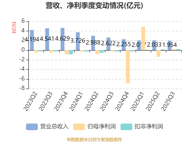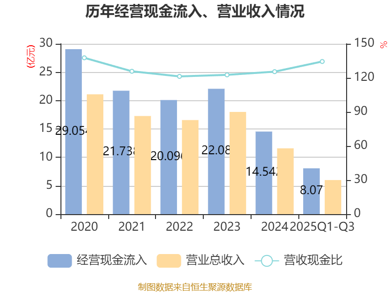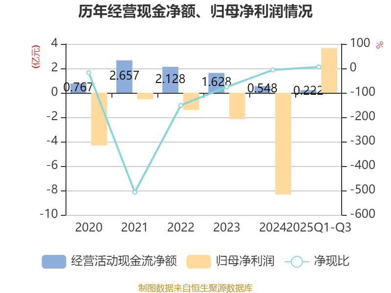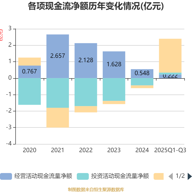2025年前三季度,公司经营活动现金流净额为2223.56万元,同比下降71.73%;筹资活动现金流净额2.06亿元,同比增加2.2亿元;投资活动现金流净额1178.15万元,上年同期为-4056.26万元。