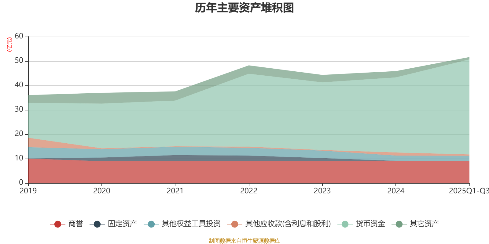 资产重大变化方面,截至2025年三季度末,公司货币资金较上年末增加26.61%,占公司总资产比重上升8.36个百分点;商誉较上年末没有变化,占公司总资产比重下降2.18个百分点;其他应收款(含利息和股利)较上年末减少57.13%,占公司总资产比重下降1.7个百分点;应收票据及应收账款较上年末减少76.93%,占公司总资产比重下降1.57个百分点。