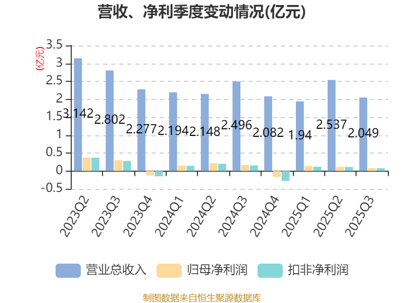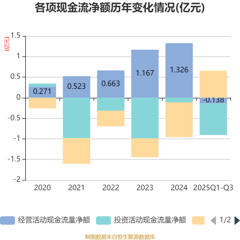 2025年前三季度,公司经营活动现金流净额为-1383.88万元,同比减少3971.05万元;筹资活动现金流净额6562.42万元,同比减少233.14万元;投资活动现金流净额-7692.03万元,上年同期为-9095.91万元。