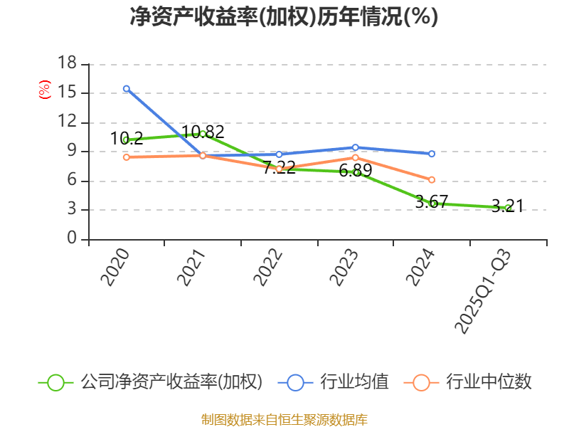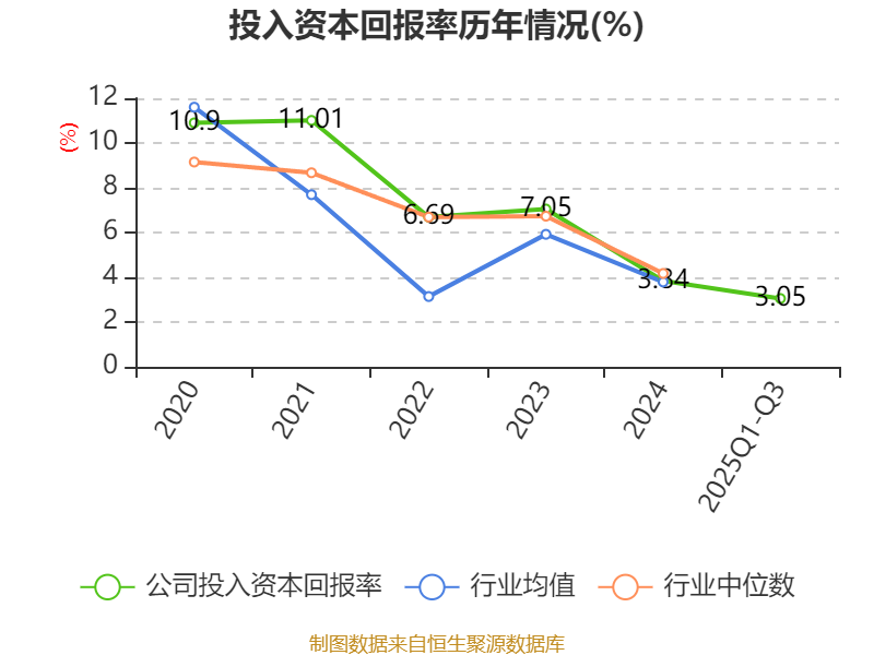 盈利能力方面, 2025年前三季度公司加权平均净资产收益率为3.21%,同比下降1.82个百分点。公司2025年前三季度投入资本回报率为3.05%,较上年同期下降1.82个百分点。