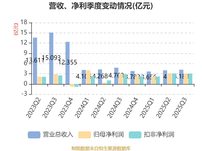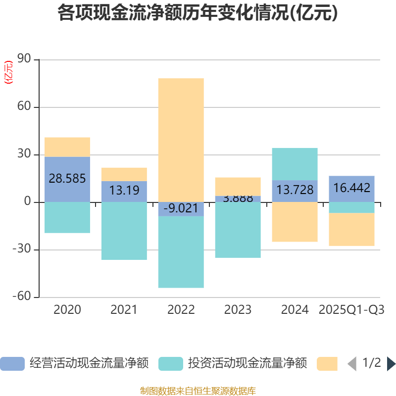 2025年前三季度,公司经营活动现金流净额为16.44亿元,同比增长192.21%;筹资活动现金流净额-20.72亿元,同比增加7.12亿元;投资活动现金流净额-7.04亿元,上年同期为38.51亿元。