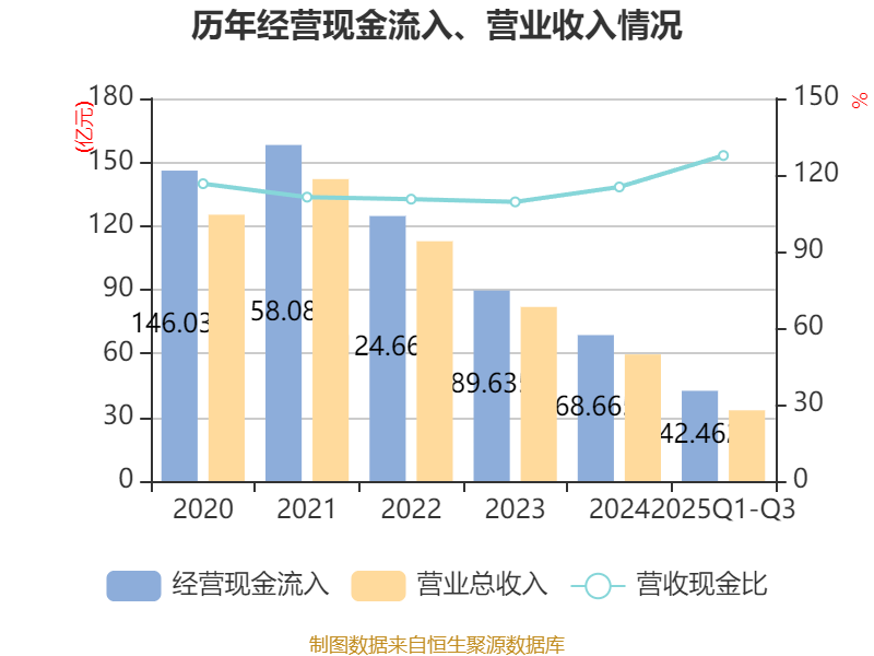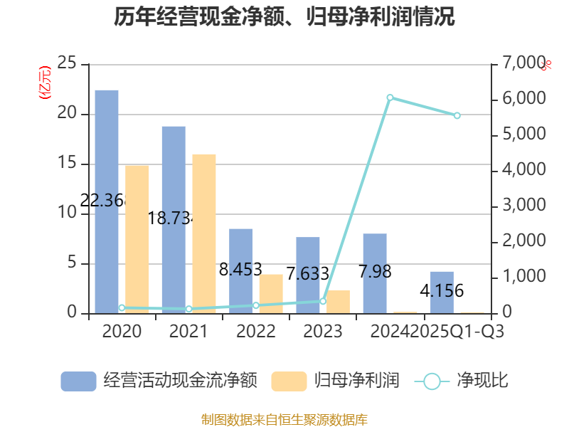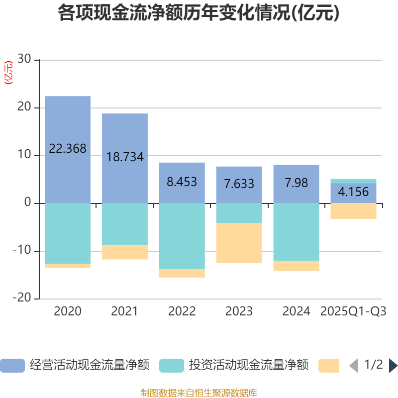 2025年前三季度,公司经营活动现金流净额为4.16亿元,同比增长20.81%;筹资活动现金流净额-3.33亿元,同比减少1.07亿元;投资活动现金流净额8676.71万元,上年同期为-11.39亿元。