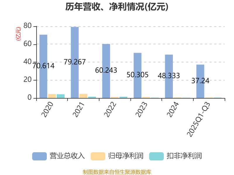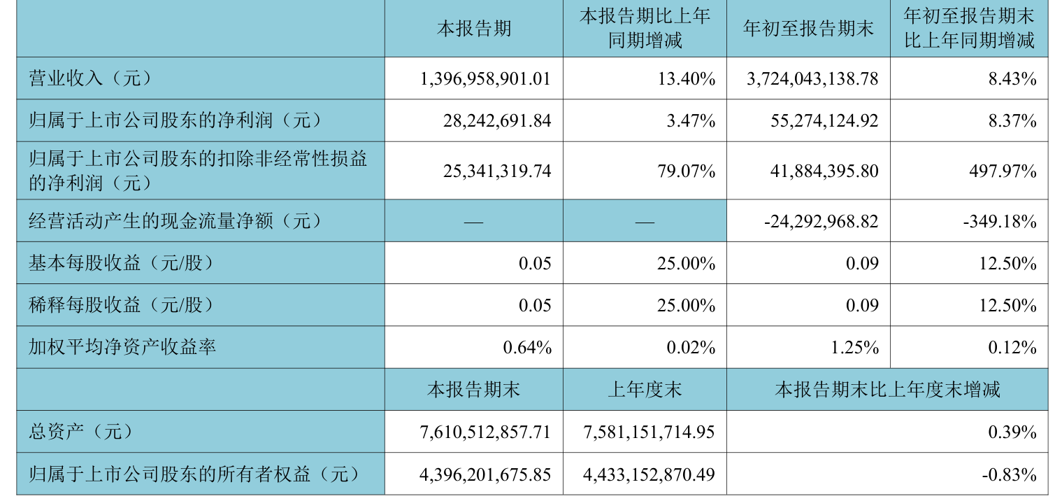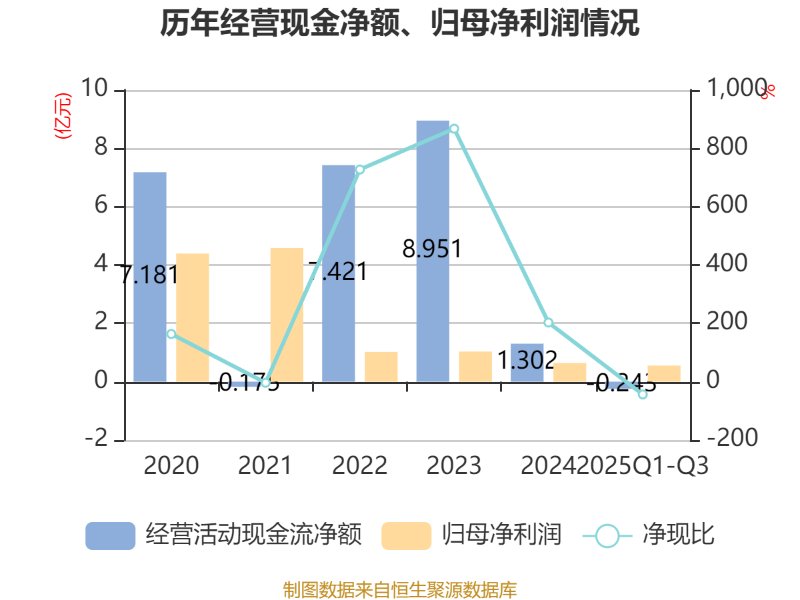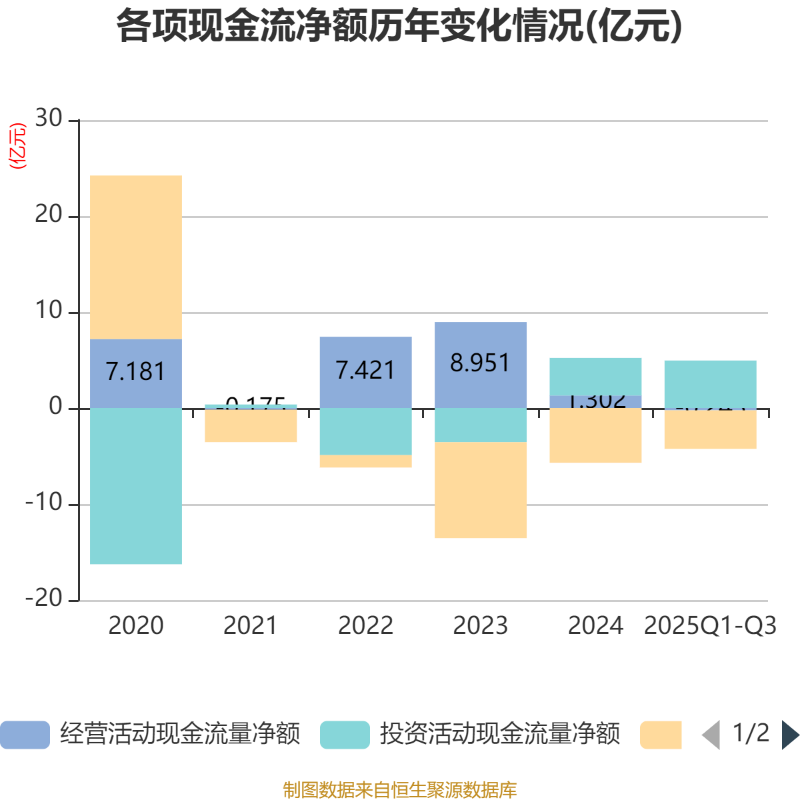 2025年前三季度,公司经营活动现金流净额为-2429.3万元,同比减少3404.23万元;筹资活动现金流净额-4.01亿元,同比增加3.58亿元;投资活动现金流净额4.95亿元,上年同期为7.17亿元。