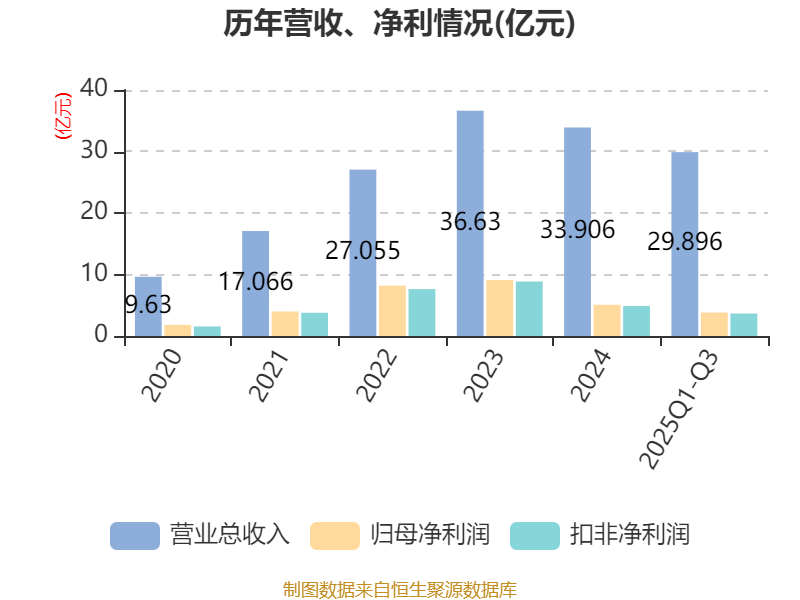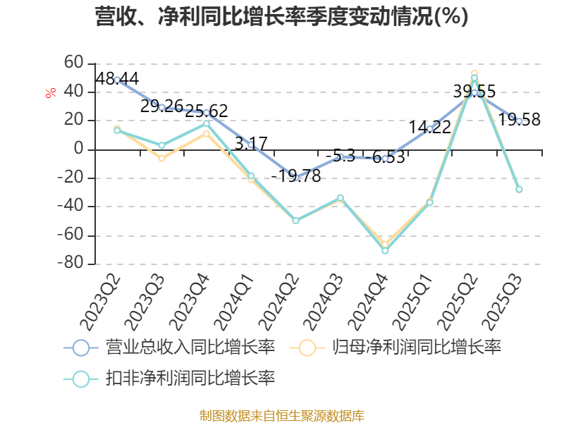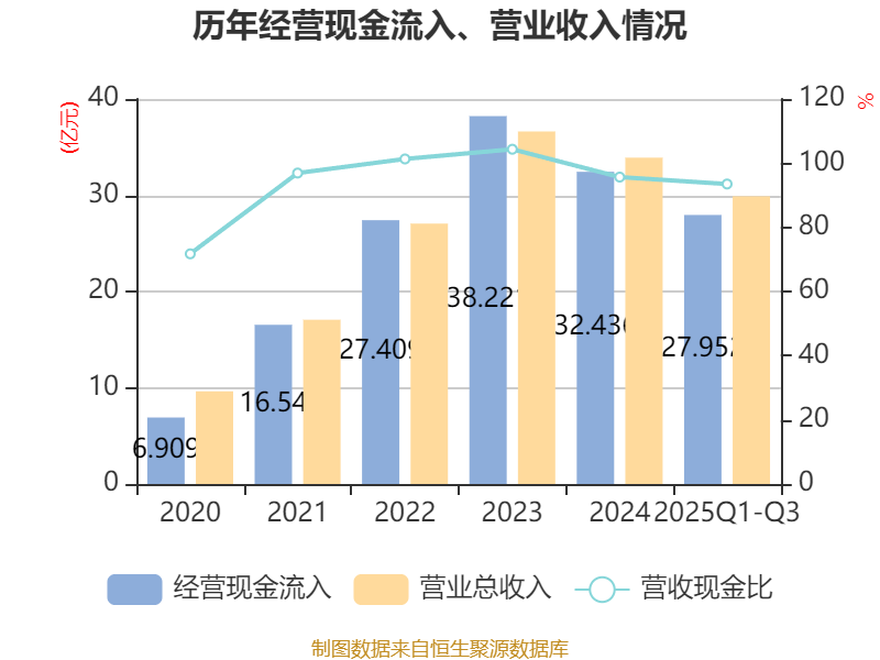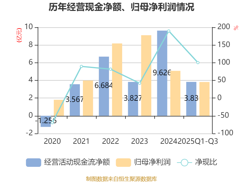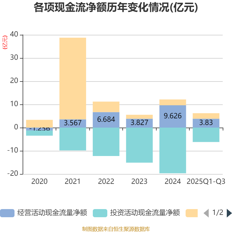 2025年前三季度,公司经营活动现金流净额为3.83亿元,同比下降41.33%;筹资活动现金流净额2.38亿元,同比减少5590.62万元;投资活动现金流净额-6.21亿元,上年同期为-17.16亿元。