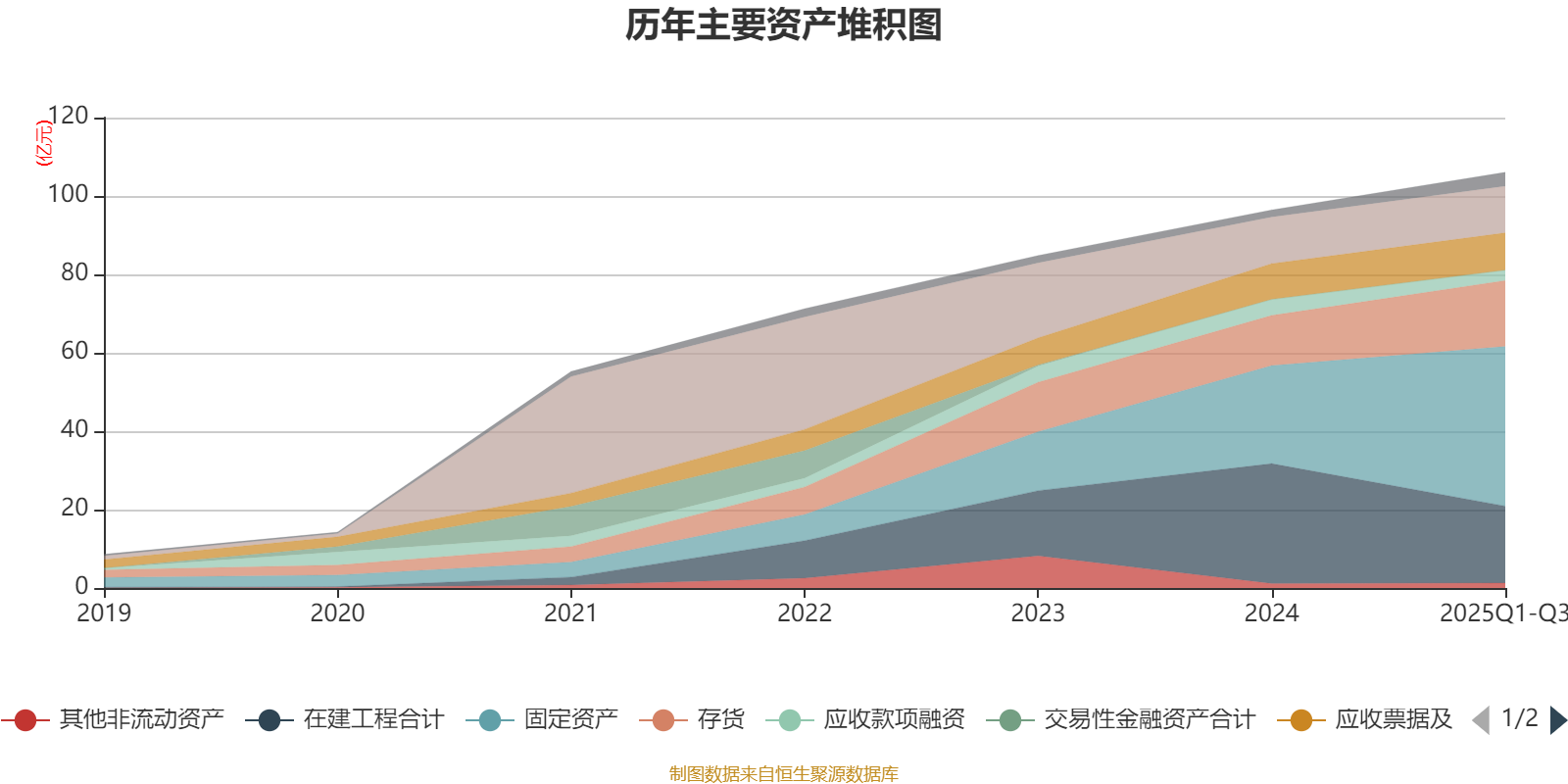资产重大变化方面,截至2025年三季度末,公司在建工程合计较上年末减少35.89%,占公司总资产比重下降13.22个百分点;固定资产较上年末增加62.78%,占公司总资产比重上升12.46个百分点;存货较上年末增加31.43%,占公司总资产比重上升2.59个百分点;应收款项融资较上年末减少35.54%,占公司总资产比重下降1.75个百分点。