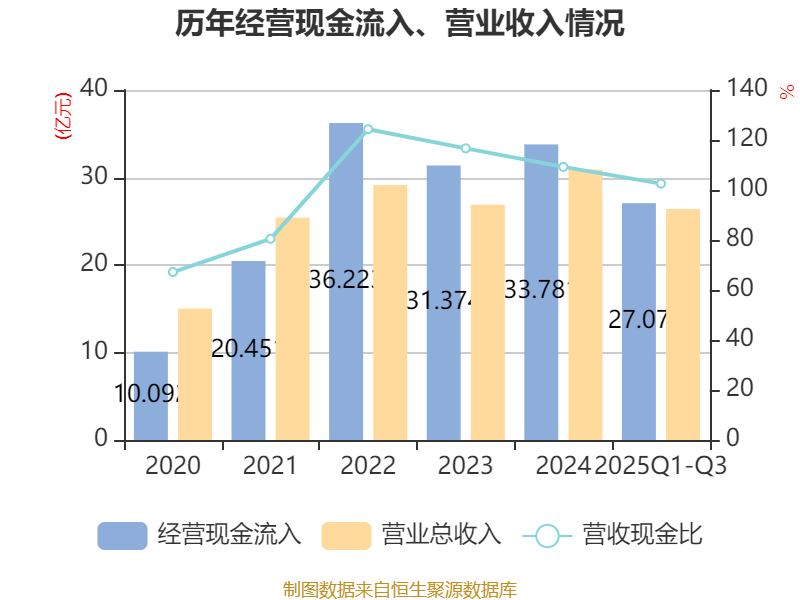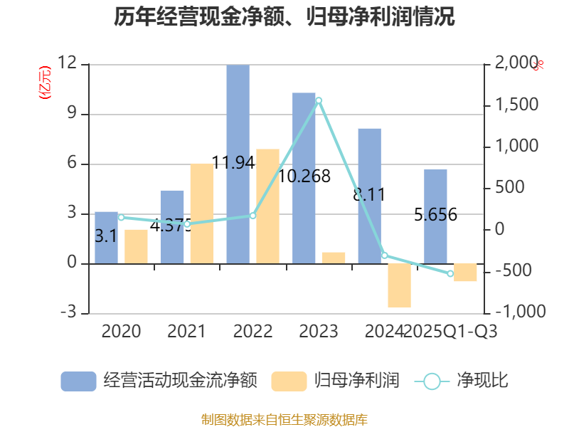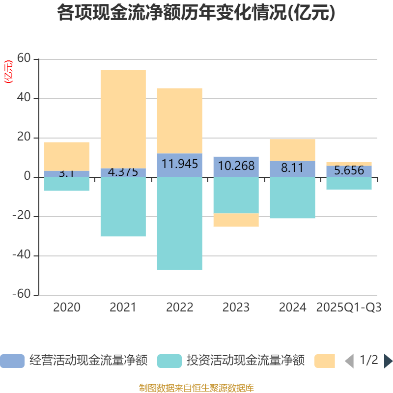 2025年前三季度,公司经营活动现金流净额为5.66亿元,同比下降11.81%;筹资活动现金流净额1.84亿元,同比减少6.43亿元;投资活动现金流净额-6.46亿元,上年同期为-17.53亿元。