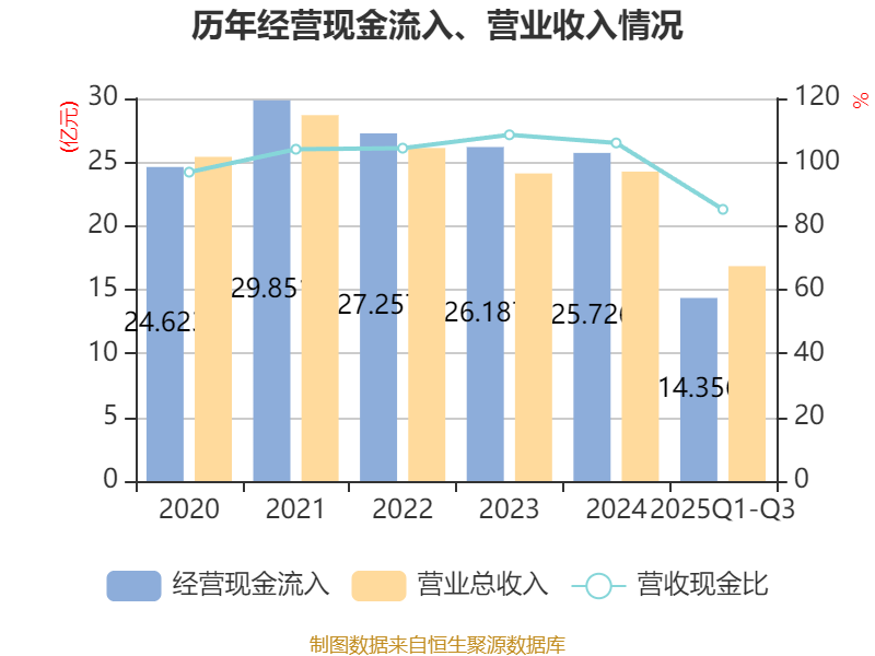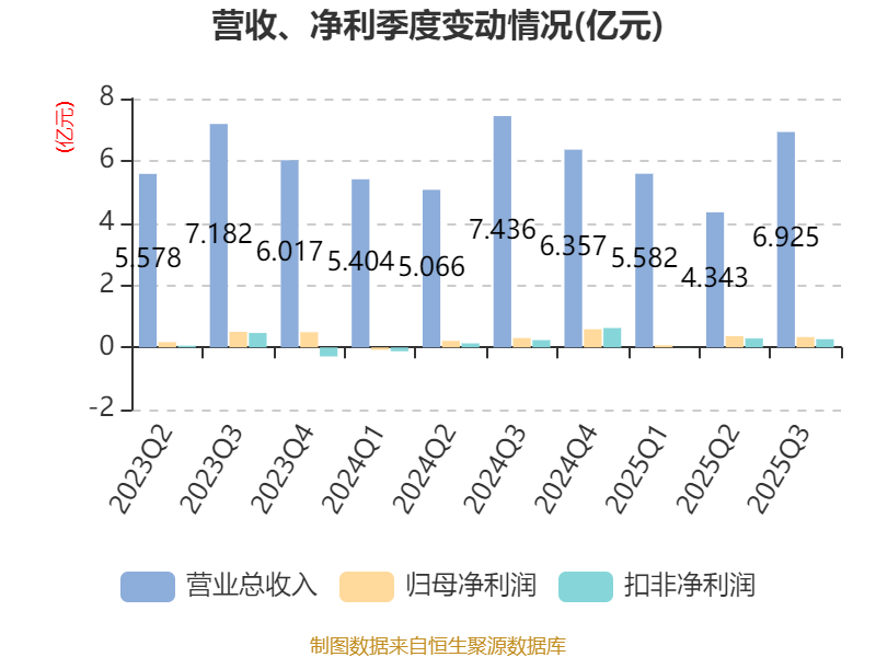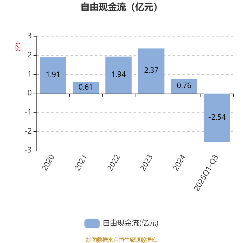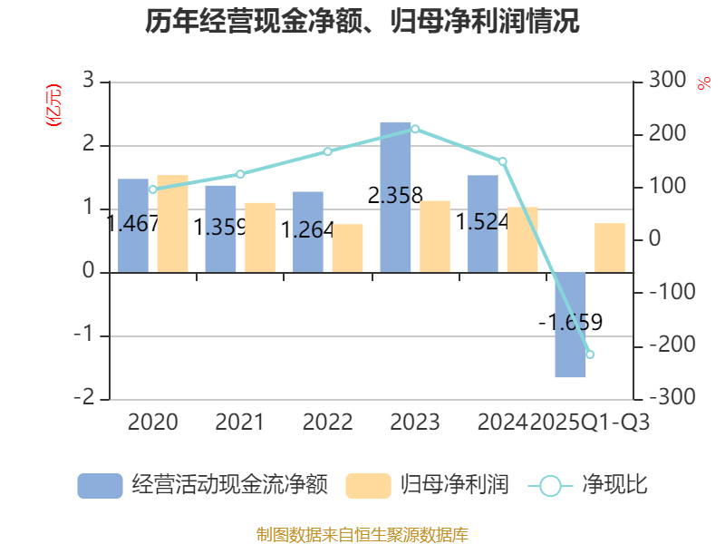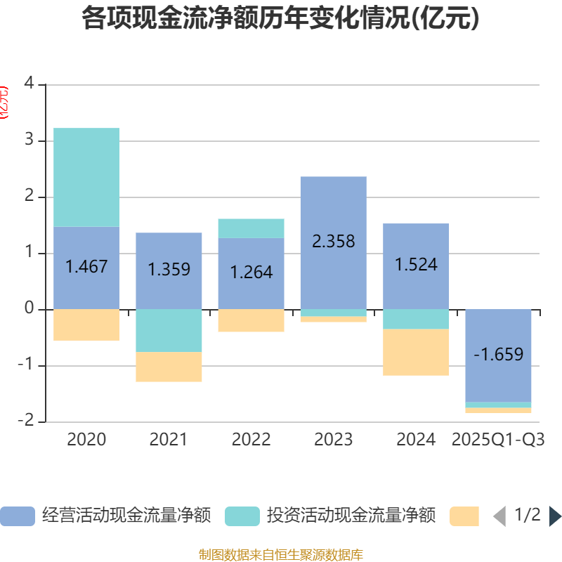 2025年前三季度,公司经营活动现金流净额为-1.66亿元,同比增加1784.23万元;筹资活动现金流净额-920.87万元,同比增加230.46万元;投资活动现金流净额-986.31万元,上年同期为-2462.59万元。