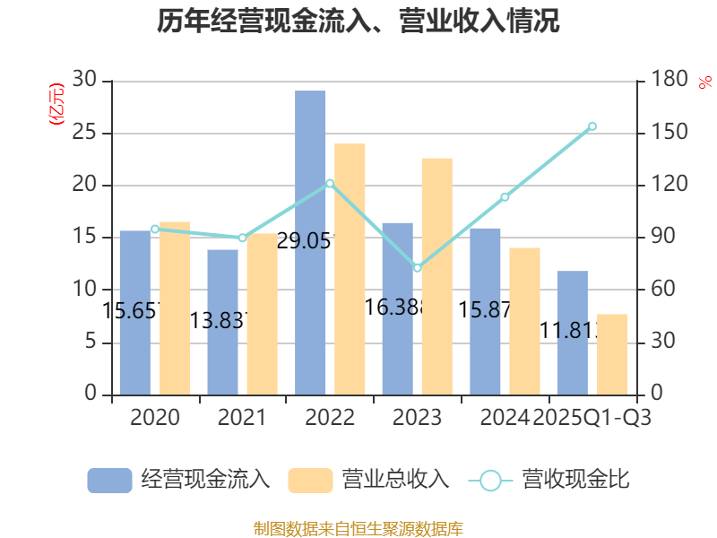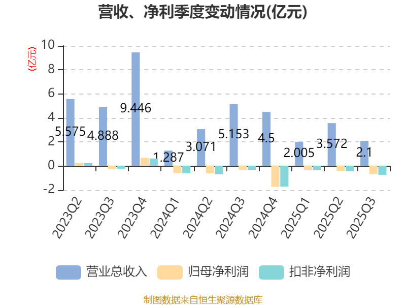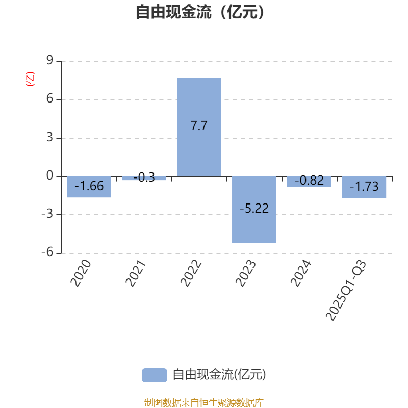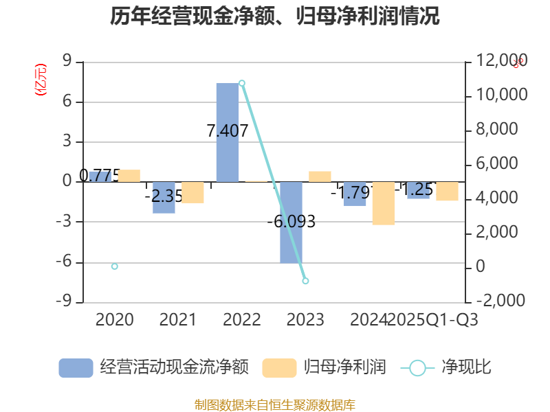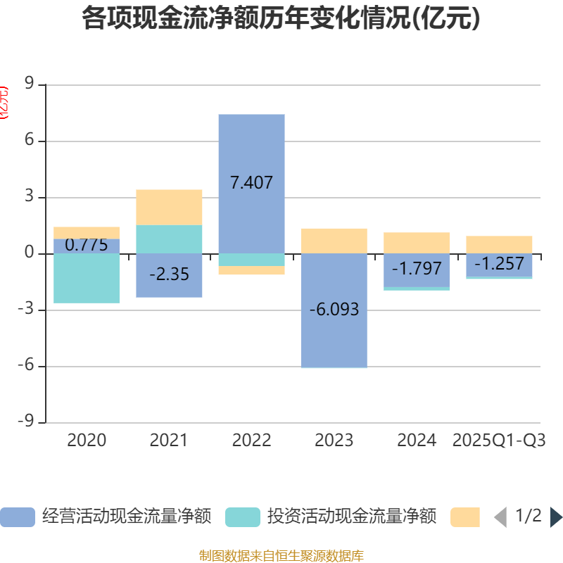 2025年前三季度,公司经营活动现金流净额为-1.26亿元,同比增加6278.26万元;筹资活动现金流净额9249.51万元,同比增加1702.4万元;投资活动现金流净额-1030.96万元,上年同期为-3245.23万元。